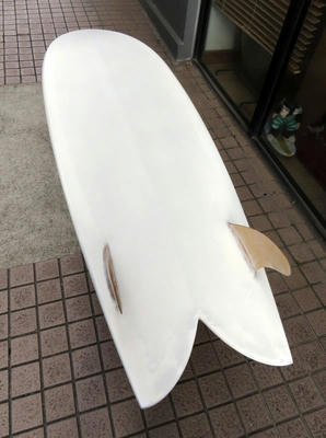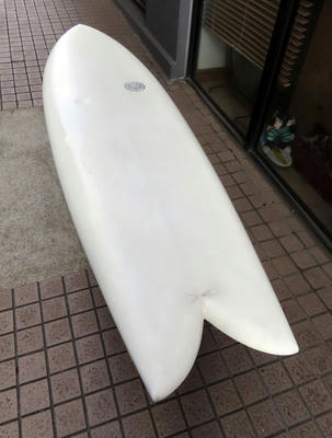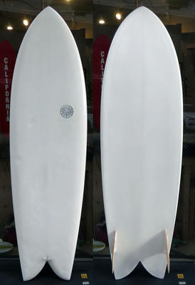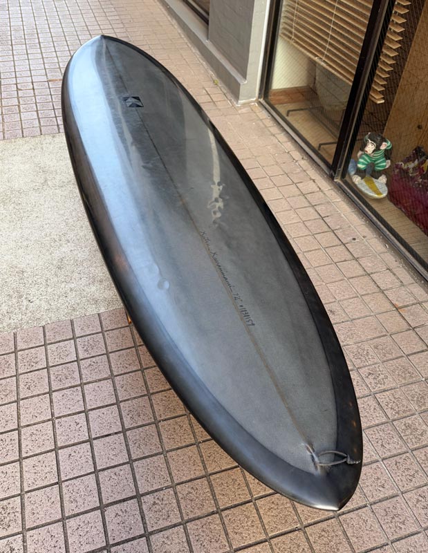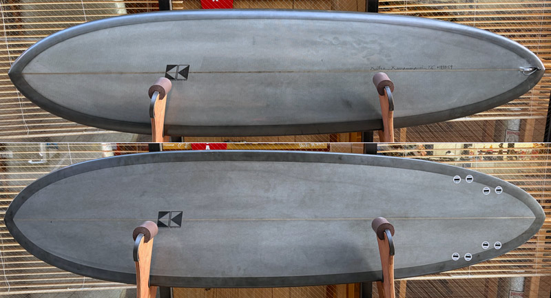 カツカワミナミサーフボード KK FISHです。パドルがイージーで、テイクオフが速いラウンドノーズと絞り気味のテールが特徴のフィッシュモデルです。ノーズ寄りのバランスはスピードを付けやすく、絞り気味のテールとシングルフォイルのフィンでコントロール性が高いセッティングになっています。フラットデッキとダウンレールの組み合わせはクラシカルな雰囲気です。ファンな外観ですが、サイズアップした波も楽しめるポテンシャルを持っています。カツカワミナミサーフボードのラインアップの中でも20年以上の歴史がある、根強い人気があるフィッシュモデルです。