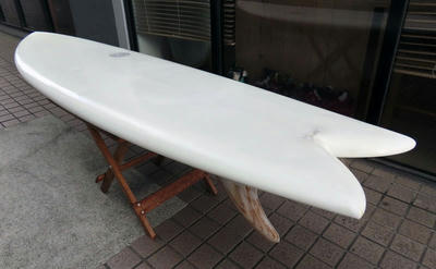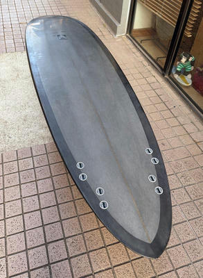 AC SHAPE トライフィンのミッドレングスのユーズドボードです。ワイドがあるセンターからベビーフィッシュのテールへ絞り込んだアウトラインで、滑りの楽しさとトライフィンのパフォーマンス性を融合させています。日常のコンディションからサイズがある波まで、幅広い使い方ができるミッドレングスです。デッキにフットマークがあります。ボトムは綺麗な状態で、リペアが必要なキズはありません。プラグはFCS2です(イモネジ入ってません)。画像のフィンは付属しません。