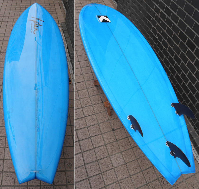 ワイドノーズと絞り気味のフィッシュテールはカツカワミナミサーフボードオリジナルのアウトラインのKK FISHです。レイクが入ったシングルフォイルのキールフィンとVEEボトムは、クラシックフィッシュのBOINTAとまた違った面白さがあります。