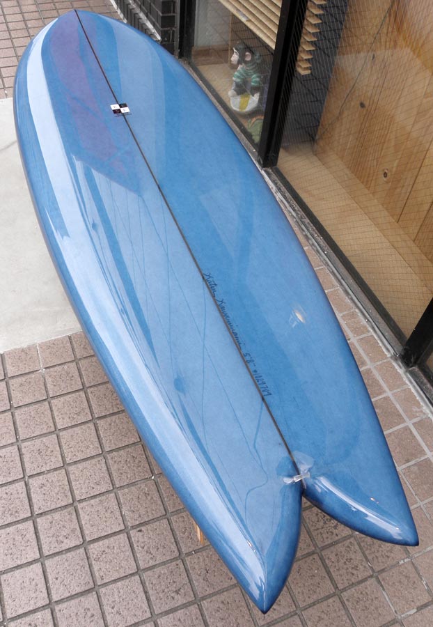 フラットロッカーと直線的なアウトラインを描き出す細身のアウトラインが特徴的なクラシックログです。レールはボリュームがある50/50。ボトムはゆるいロールドボトムです。3/4インチ幅のレッドシダーストリンガーを使用し、同じレッドシダーをラミネートしたDフィンをグラスオンしました。ボランクロスの微妙な色合いが美しいクラシックボードです。