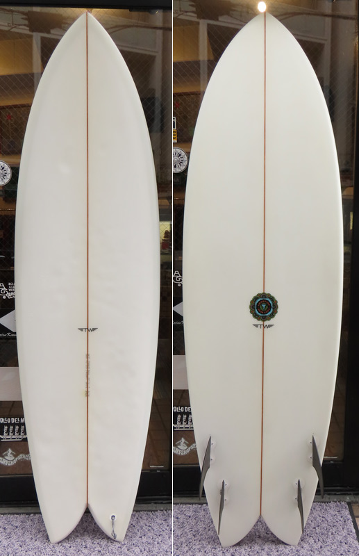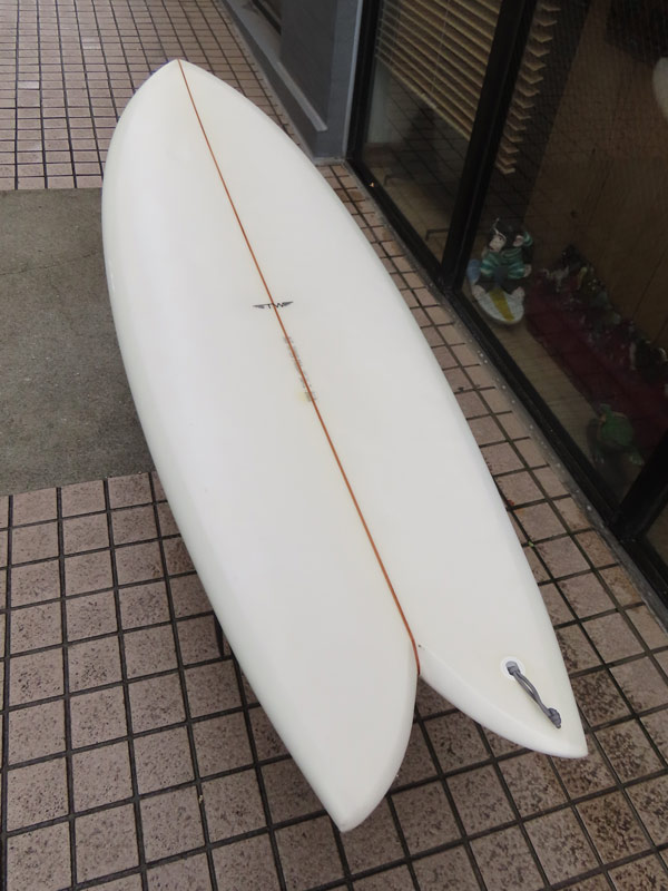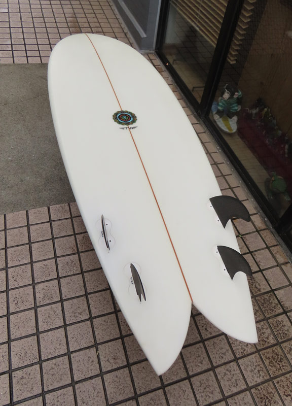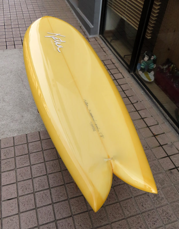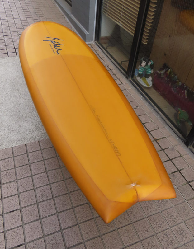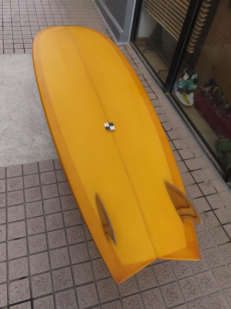 カツカワミナミサーフボード KK FISHです。パドルがイージーで、テイクオフが速いラウンドノーズと絞り気味のテールが特徴のフィッシュモデルです。ノーズ寄りのバランスはスピードを付けやすく、絞り気味のテールとシングルフォイルのフィンでコントロール性が高いセッティングになっています。フラットデッキとダウンレールの組み合わせはクラシカルな雰囲気です。ファンな外観ですが、サイズアップした波も楽しめるポテンシャルを持っています。カツカワミナミサーフボードのラインアップの中でも20年以上の歴史がある、根強い人気があるフィッシュモデルです。