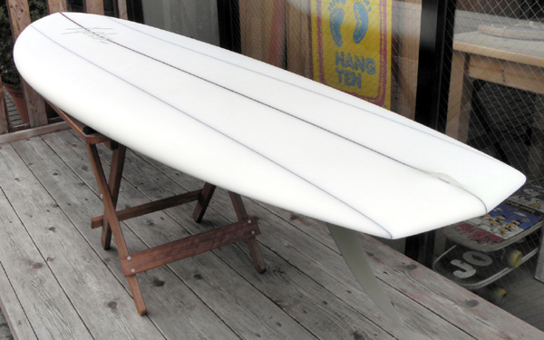 ハルボトムにコンケーブを加えたコンビネーションボトムのハルスタビーです。コンケーブとフィン周りのシェイプによって直進性とコントロール性を高めた乗り手の希望にあわせたシェイプが施されています。ハル由来のボトムからまくってくるレールとコンケーブの組み合わせもまた特別な感覚とスピードを生み出しています。グルーラインとレッドウッドのウェッジストリンガーの3ストリンガー調のフォームを使っています。カツカワミナミナミサーフボードでは、乗り手の希望にあわせたハル・スタビーをお作りします。お気軽にご相談ください。