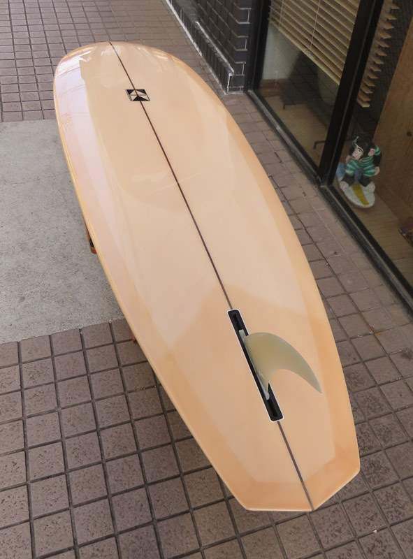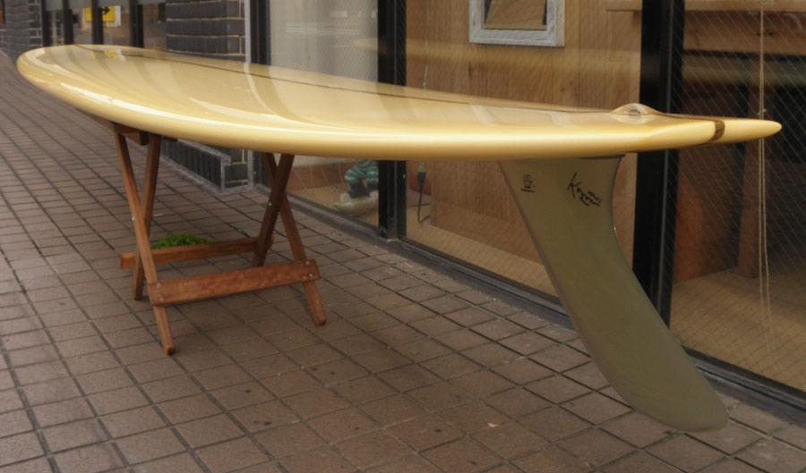 1960年代のPIGをイメージして作ったロングボードです。細身のアウトライン、フラット気味のロッカー、50/50レール、テールエンドにどっしりとグラスオンされたDフィン。どこを取ってもクラシックです。高密度発泡のカラーフォームを挟みこんだダブルストリンガーを8オンスのボランクロスでラミネートしています。