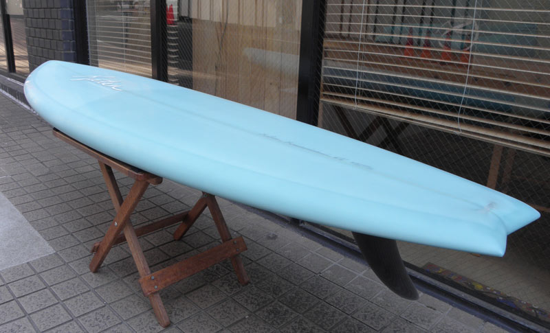 ライアン・ラブレイスのシェイプによる、ポイント・コンセプトのユーズドロングボードです。興味をそそるシェイプです。レールはナイフィーな50/50で、ボトムは全体的に滑らかなコンベックスが基調になっています。ノーズは浅くスムースなノーズコンケーブ、その後ろは緩いラウンドボトムからテール回りはパネルVEEで、滑らかな滑走としっかりとしたコントロール性を生み出しています。テールはノーズライディングのためのアッシュトレイ形状です。浅いフットマーク、ボトムには小さな浅いヘコミがいくつかありますが、全体にきれいなコンディションです。