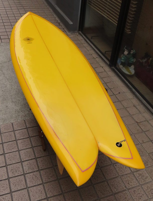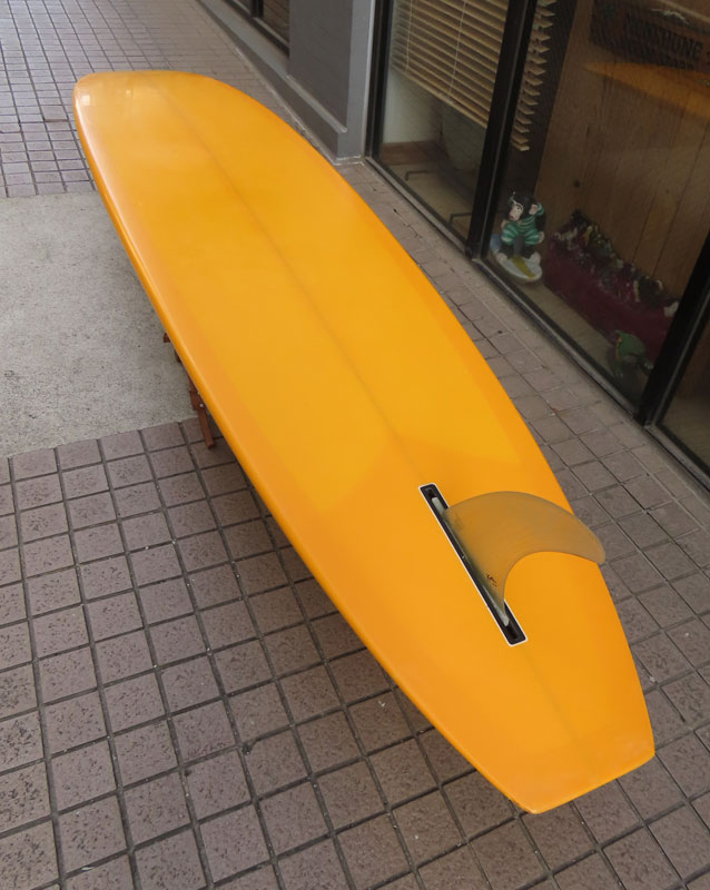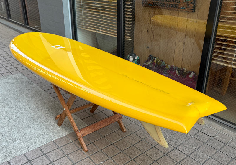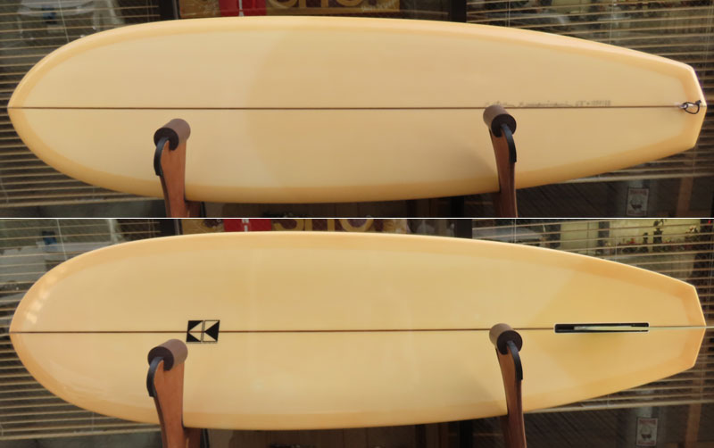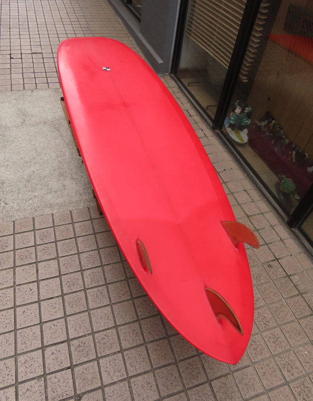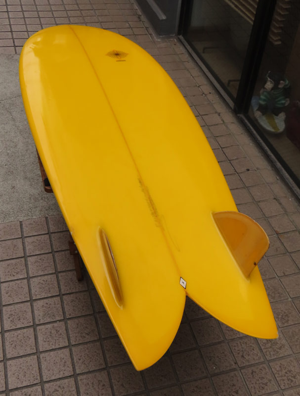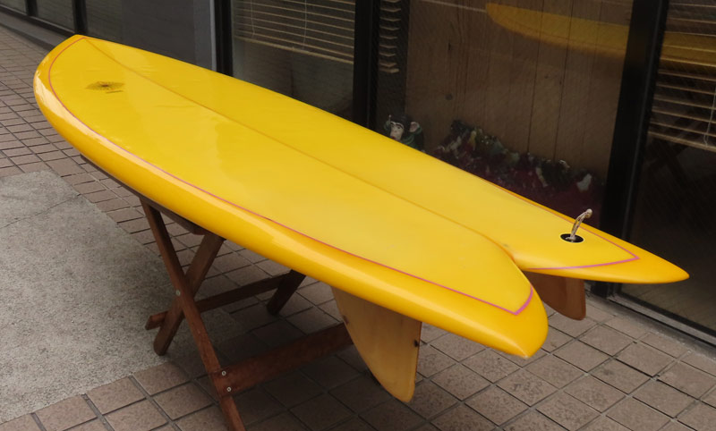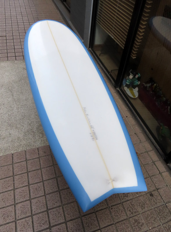 クリス・クリステンソンのフルハンドシェイプをジャック・リーブスがラミネートしたサンディエゴフィッシュです。メネフネビーチストアオーナーの宮嶋が2003年ごろにクリステンソンにオーダーをして作ってもらったボードです。乗られてきたボードなのでダメージがあります。デッキはテール回りラミネートの補修跡、テイクオフで手を着く場所はラミネートが浮いて来ています(リペア可能です)。その他、レールに小さなキズがひとつあります。
