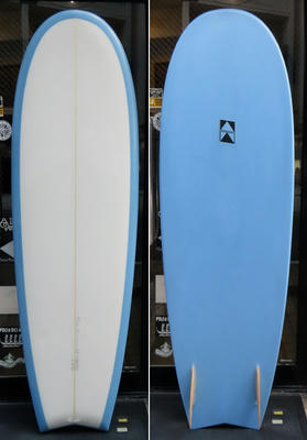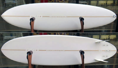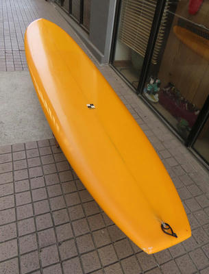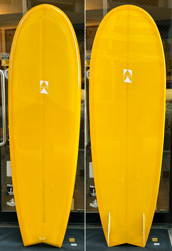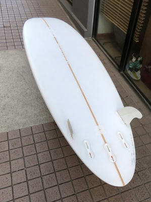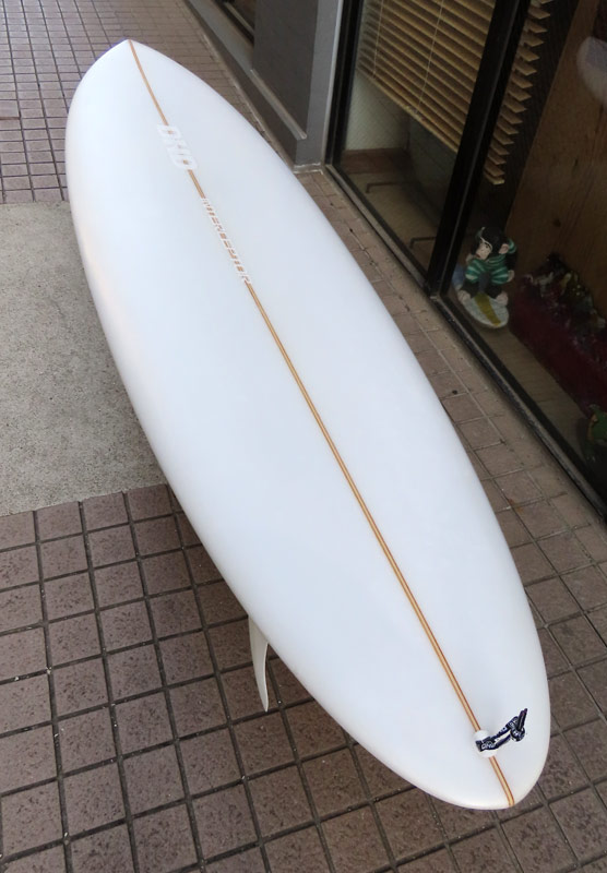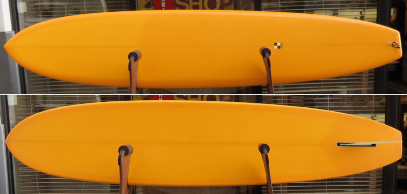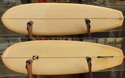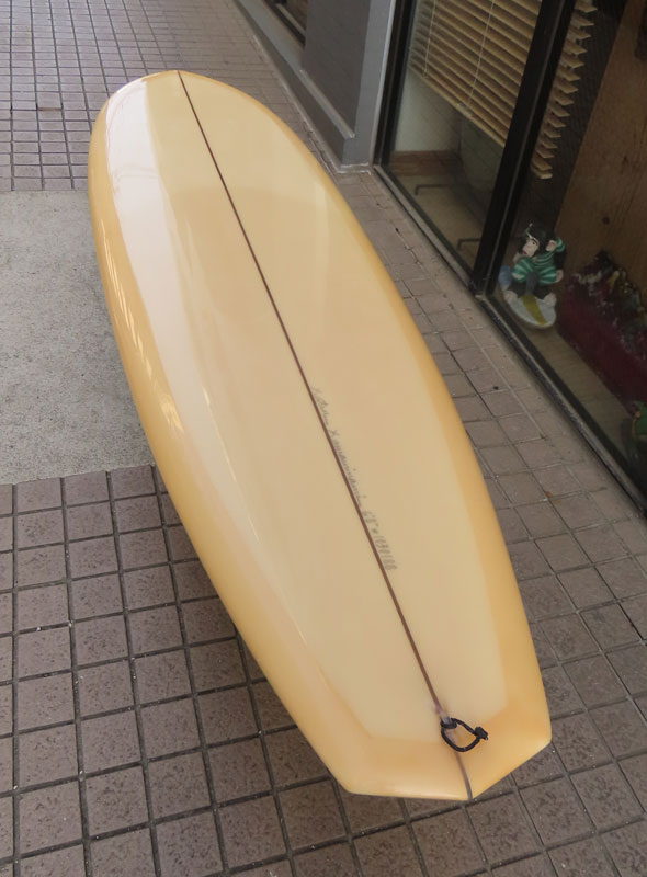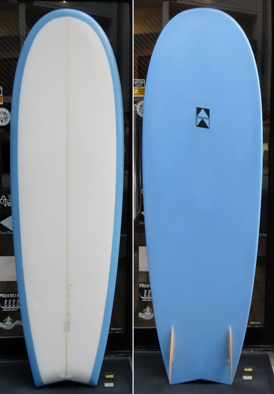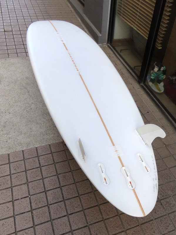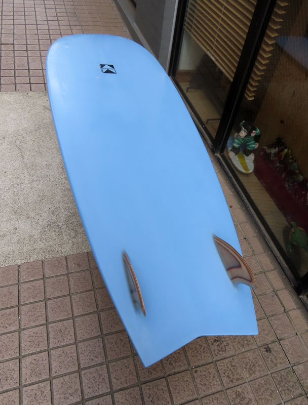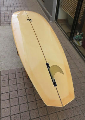 クリス・クリステンソンのフルハンドシェイプをジャック・リーブスがラミネートしたサンディエゴフィッシュです。メネフネビーチストアオーナーの宮嶋が2003年ごろにクリステンソンにオーダーをして作ってもらったボードです。乗られてきたボードなのでダメージがあります。デッキはテール回りラミネートの補修跡、テイクオフで手を着く場所はラミネートが浮いて来ています(リペア可能です)。その他、レールに小さなキズがひとつあります。