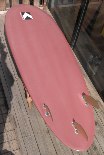 ちょい短め、6フィートジャストの長さで作ったショートバージョンのMINIです。MINIの基本は6’8”ですが、お好みに合わせたサイズでシェイプすることができます。MINI2と違う点はボトムのシェイプ。MINI2はコンケーブが入ってきます。どちらをどのように選べばいいかはオーダーのときにご相談ください。ばっちりご相談に乗ります。カラーは薄めのセージグリーンピグメントをサンディングで地味爽やかにナチュラルな雰囲気の仕上がりです。フィンはトライの他、シングル、2+1、5フィン、4フィンでお作りすることができます。