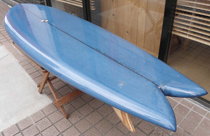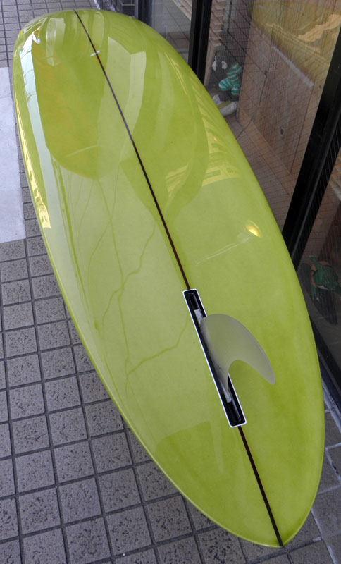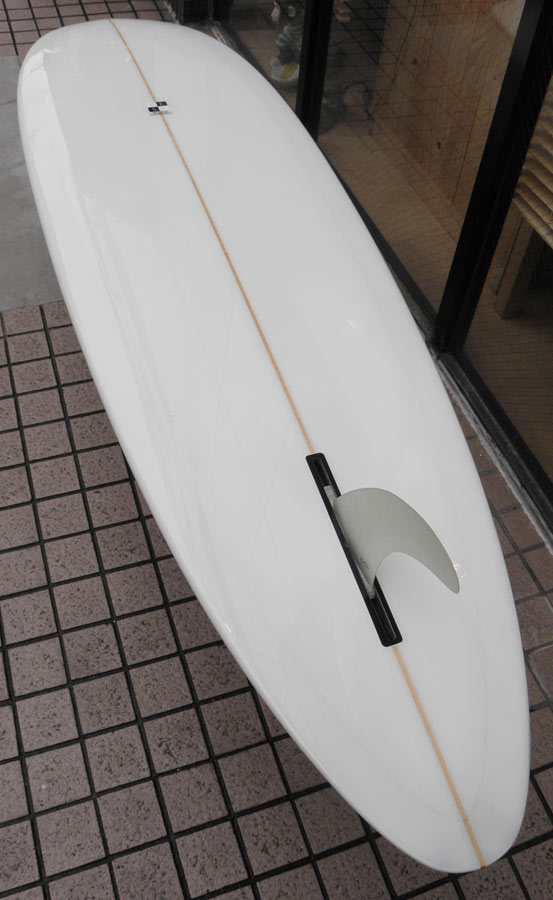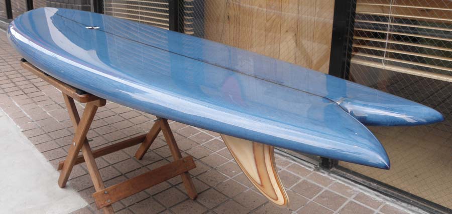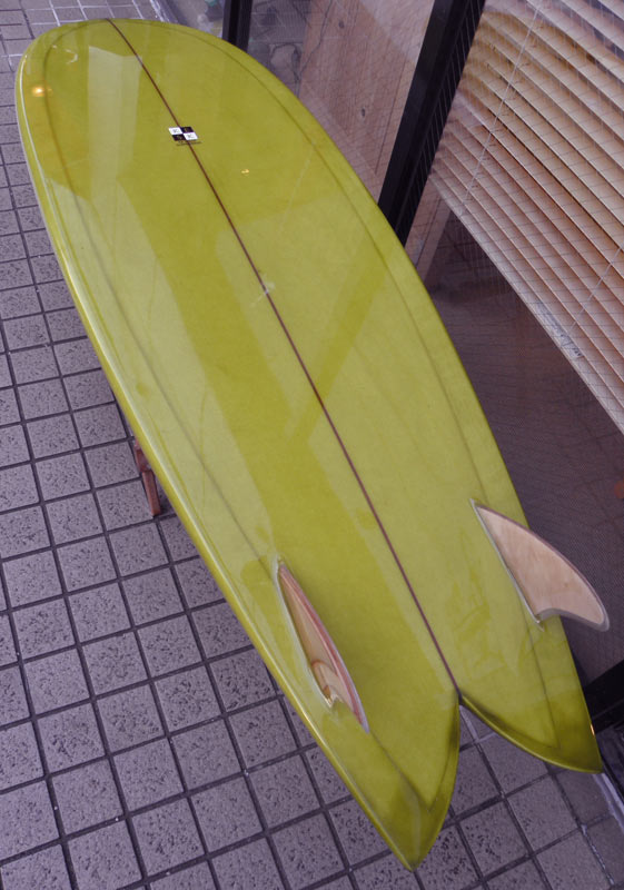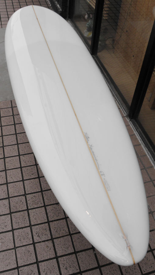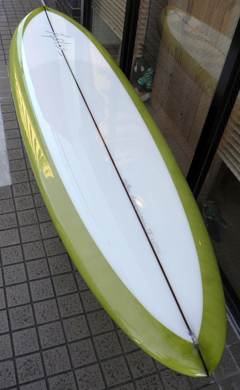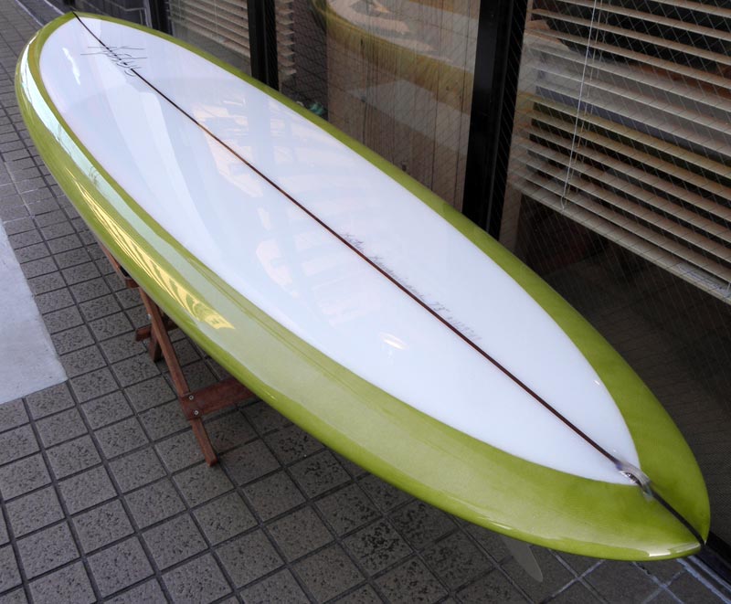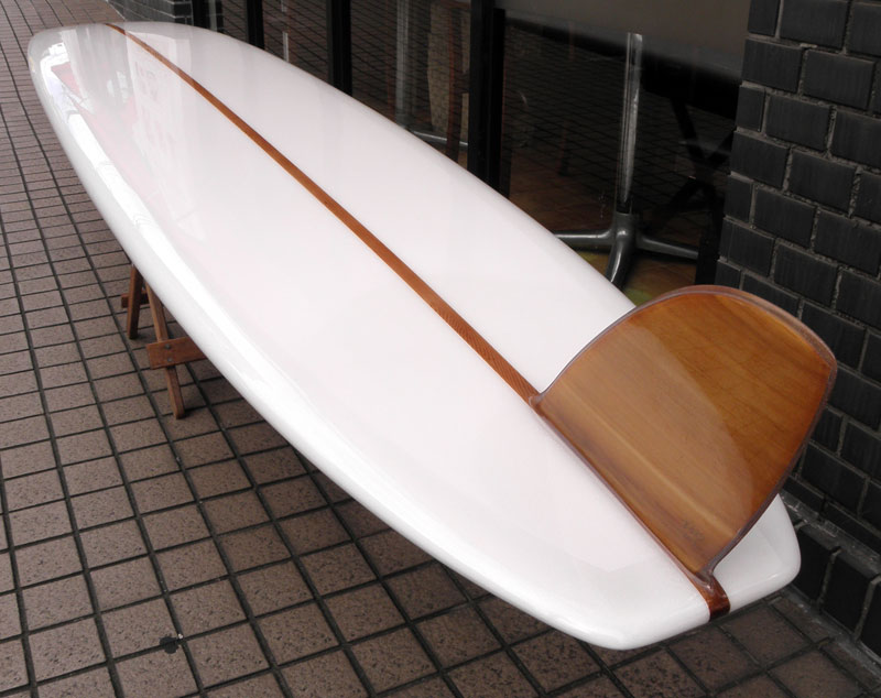 フラットロッカーと直線的なアウトラインを描き出す細身のアウトラインが特徴的なクラシックログです。レールはボリュームがある50/50。ボトムはゆるいロールドボトムです。3/4インチ幅のレッドシダーストリンガーを使用し、同じレッドシダーをラミネートしたDフィンをグラスオンしました。ボランクロスの微妙な色合いが美しいクラシックボードです。