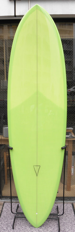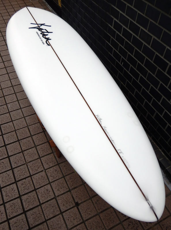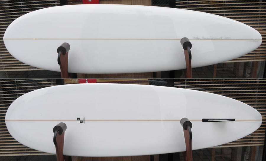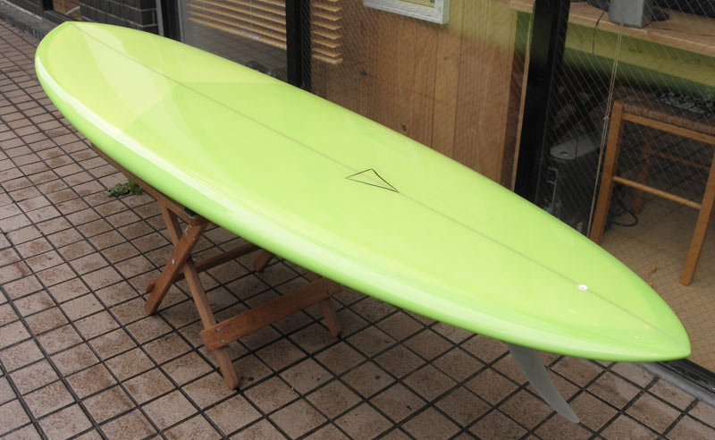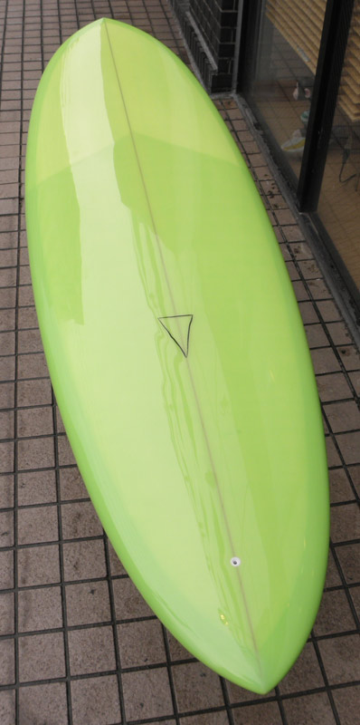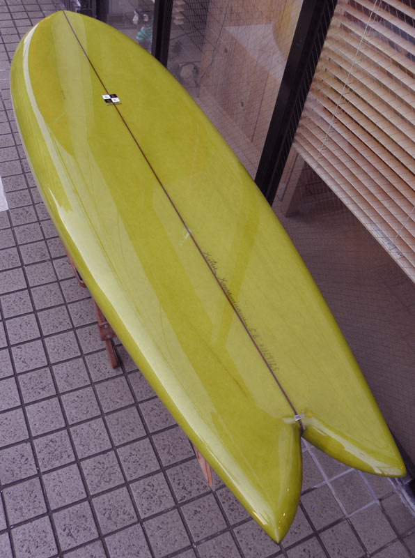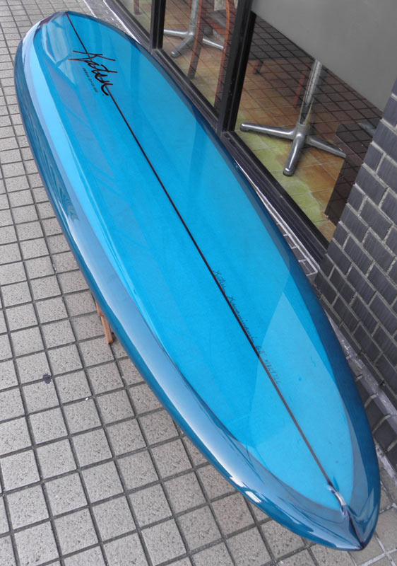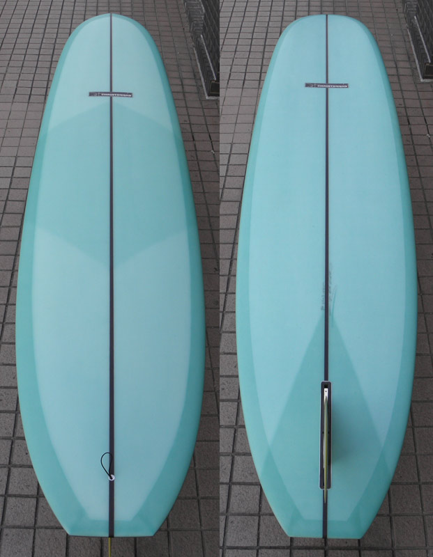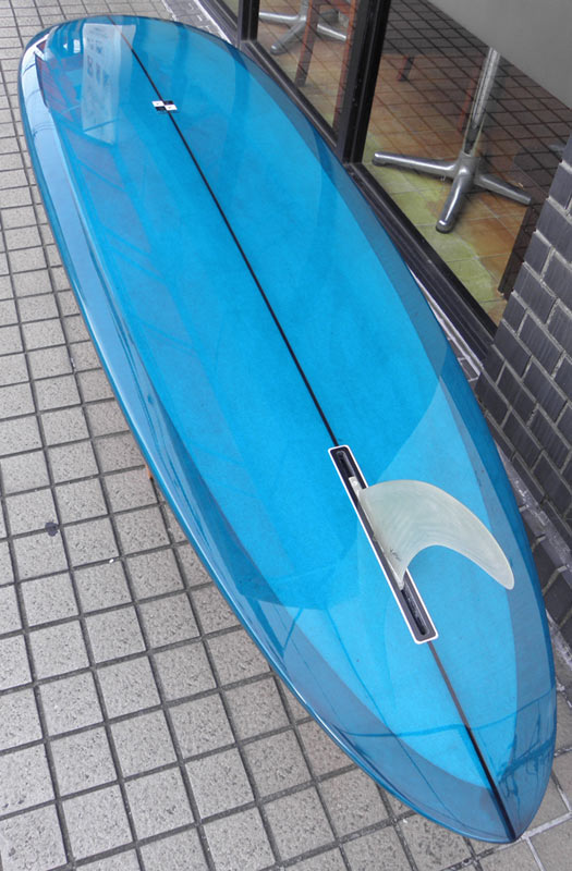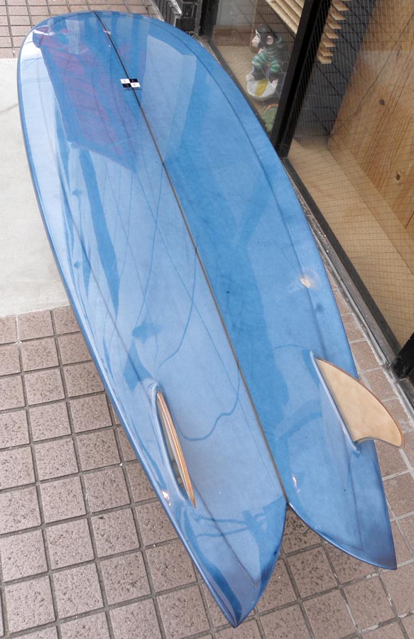 フラットロッカーと直線的なアウトラインを描き出す細身のアウトラインが特徴的なクラシックログです。レールはボリュームがある50/50。ボトムはゆるいロールドボトムです。3/4インチ幅のレッドシダーストリンガーを使用し、同じレッドシダーをラミネートしたDフィンをグラスオンしました。ボランクロスの微妙な色合いが美しいクラシックボードです。