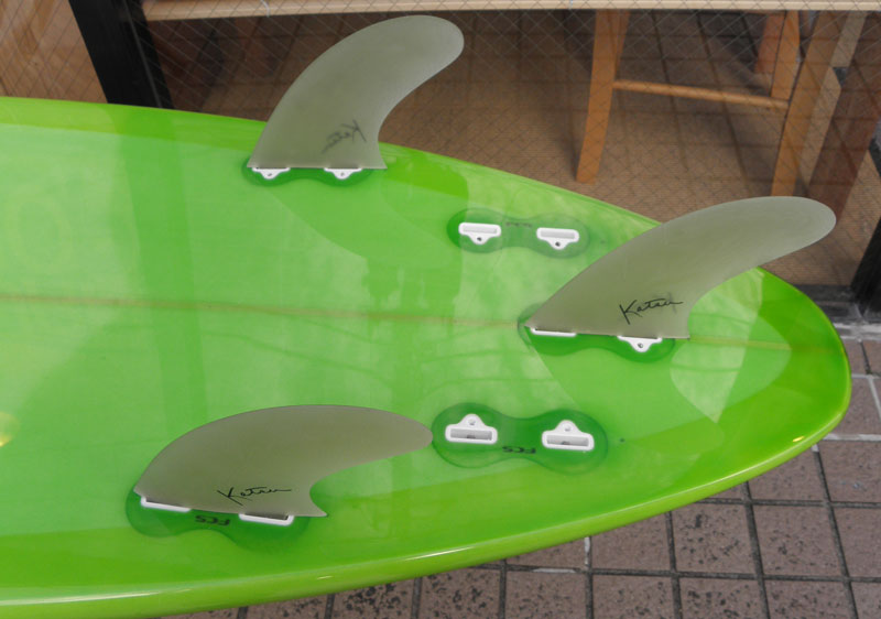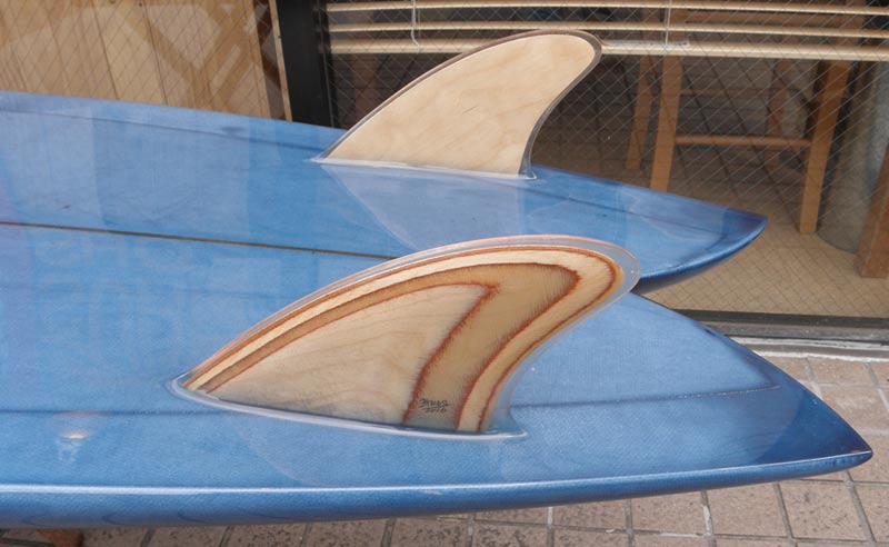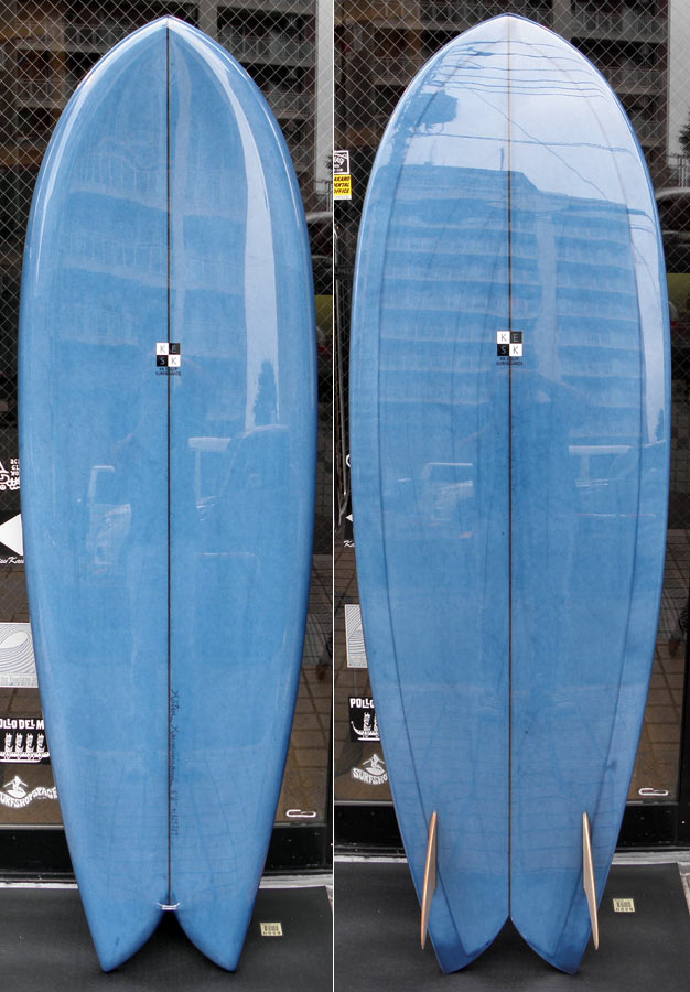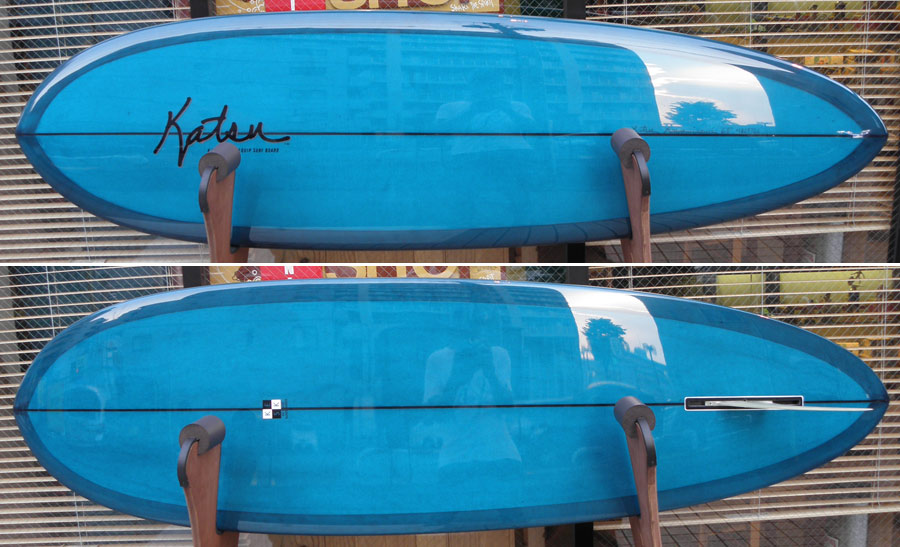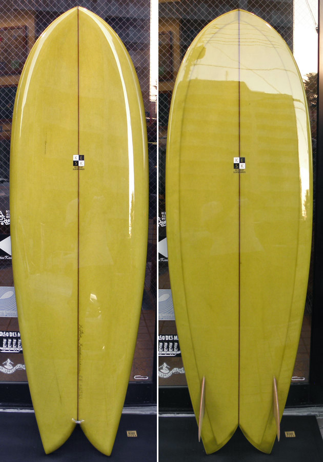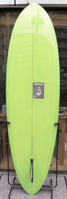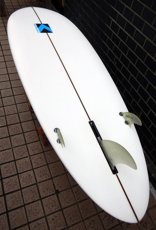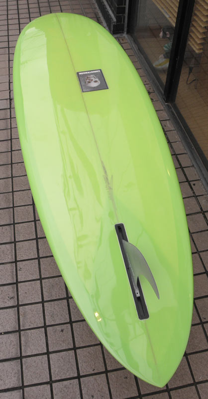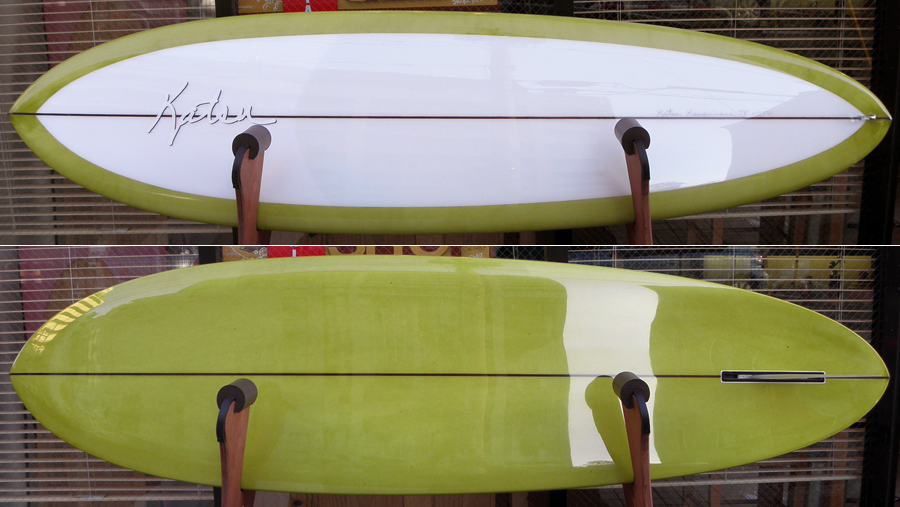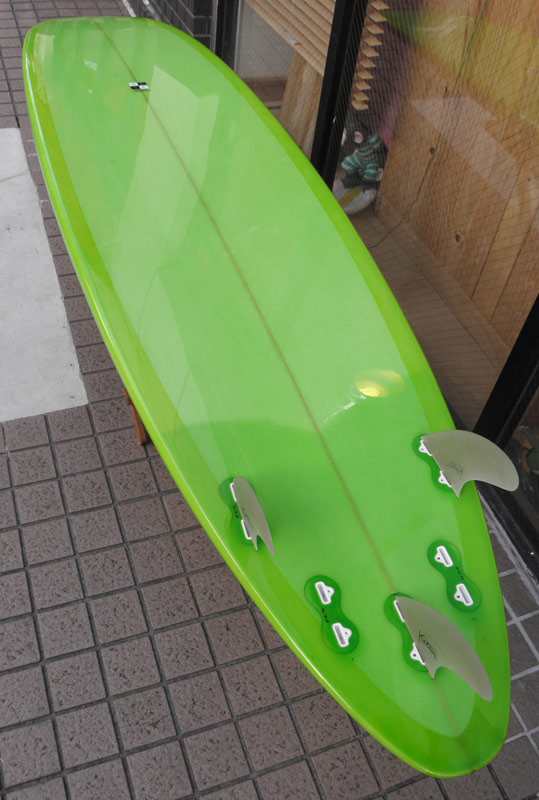 フラットロッカーと直線的なアウトラインを描き出す細身のアウトラインが特徴的なクラシックログです。レールはボリュームがある50/50。ボトムはゆるいロールドボトムです。3/4インチ幅のレッドシダーストリンガーを使用し、同じレッドシダーをラミネートしたDフィンをグラスオンしました。ボランクロスの微妙な色合いが美しいクラシックボードです。