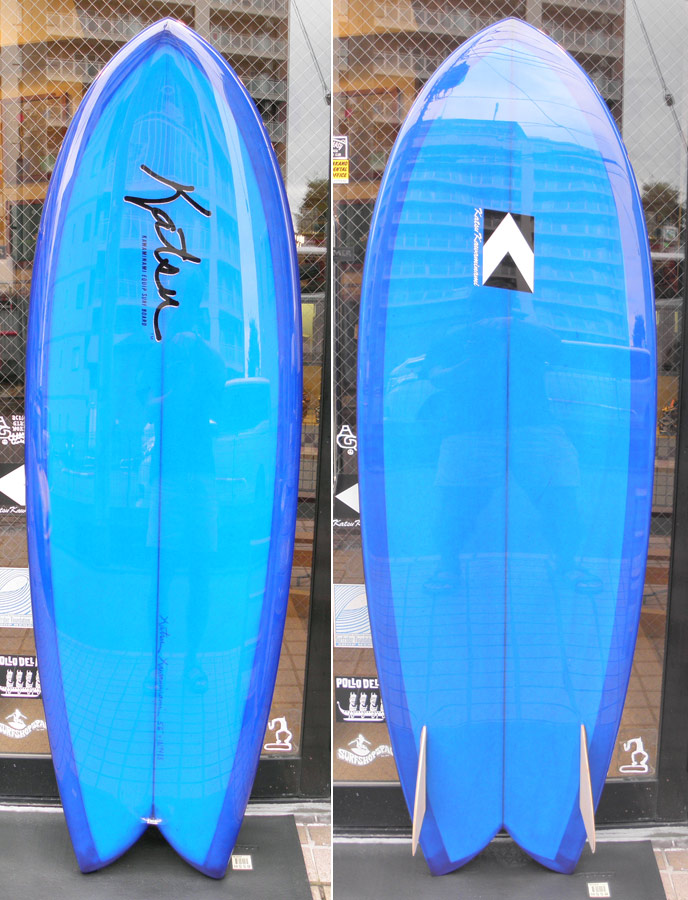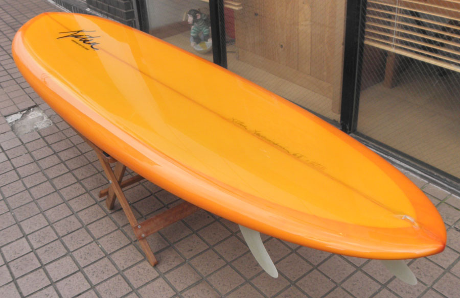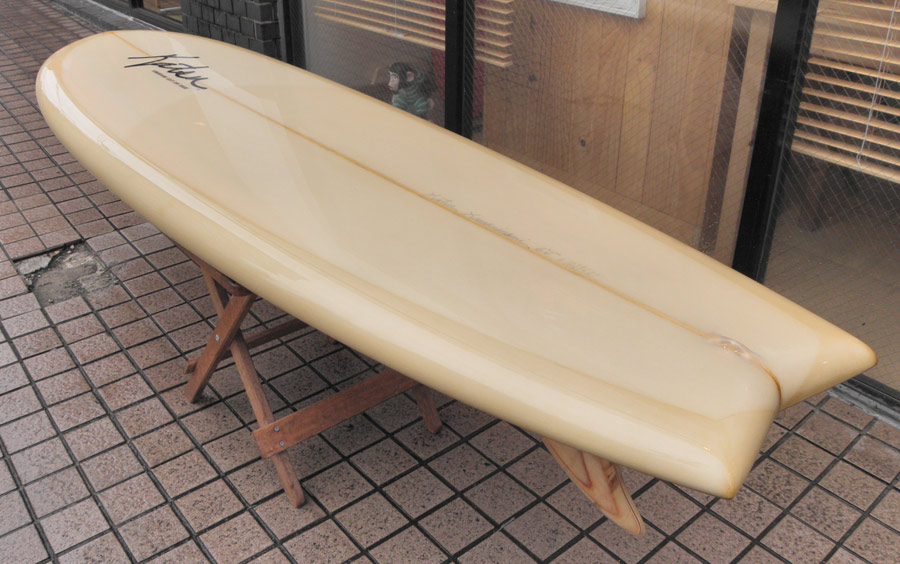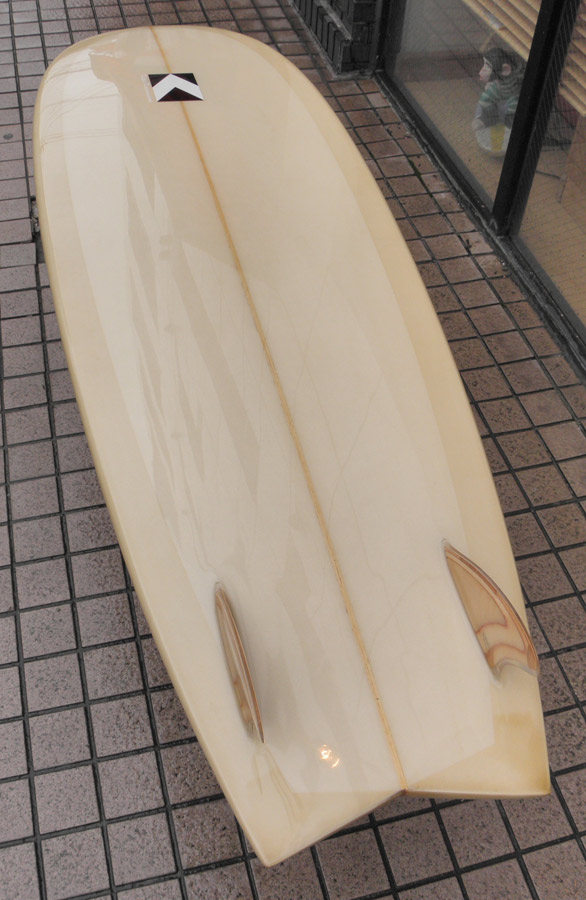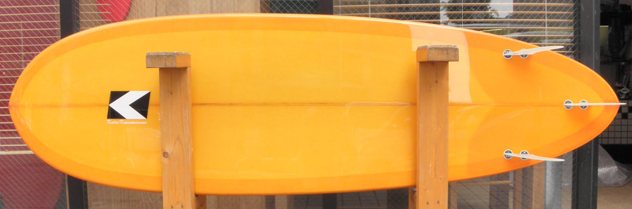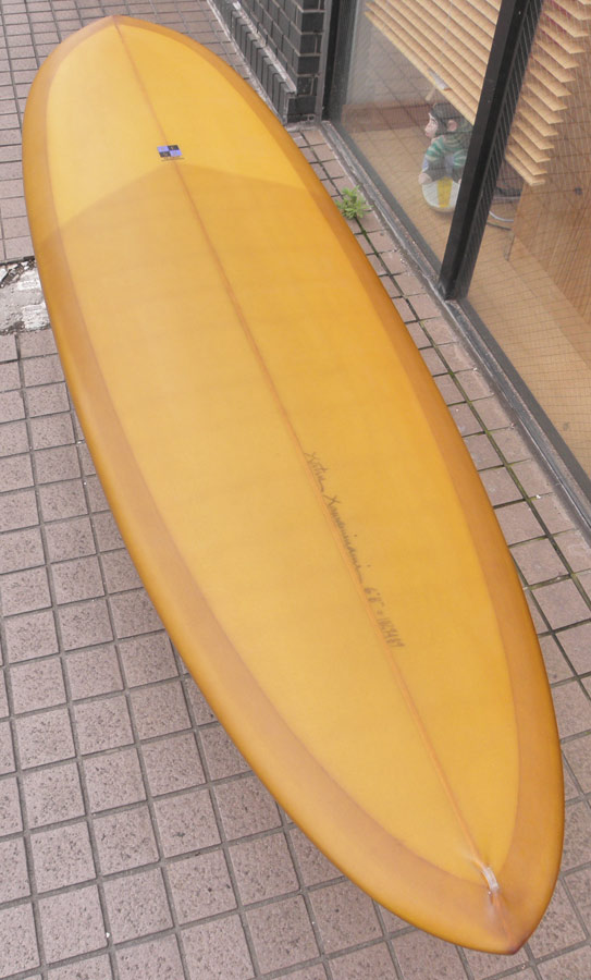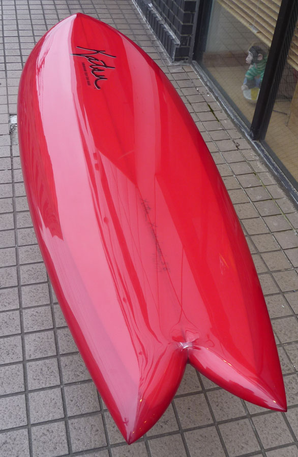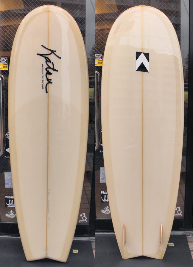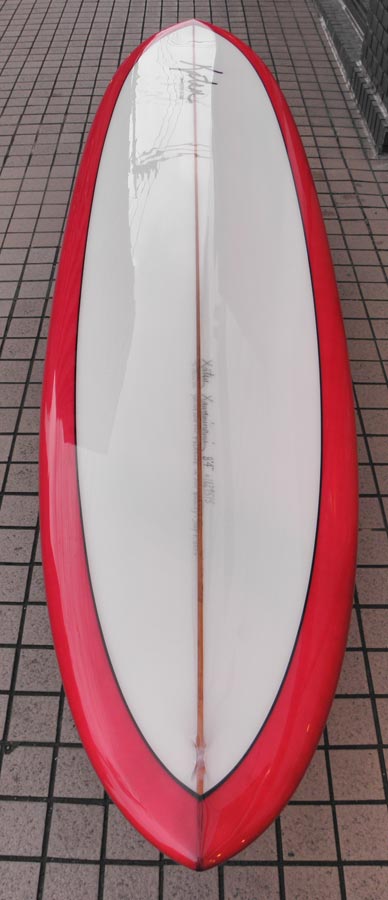 カツカワミナミサーフボードのツインフィンモデル、BOOGIEです。ワイドノーズ、たっぷりの浮力でパドルと滑り出しがとても速いファンなツインです。スピードを付けやすく、素早い波のキャッチからのダウンザラインは他のボードには無い感覚です。そのヒミツはロッカー、レールとボトムの形状、そしてフィンのセッティングにあります。どれもシェイパーである川南活が経験を基に長い時間をかけて作り出したものです。ボリューミーな外観に似合わず回転性は高く、軽快なサーフィンが楽しめます。小波でもよく滑ってくれますが、ショルダーが張った波のフェイスで踏み込んだときのレスポンスは最高の感覚です。