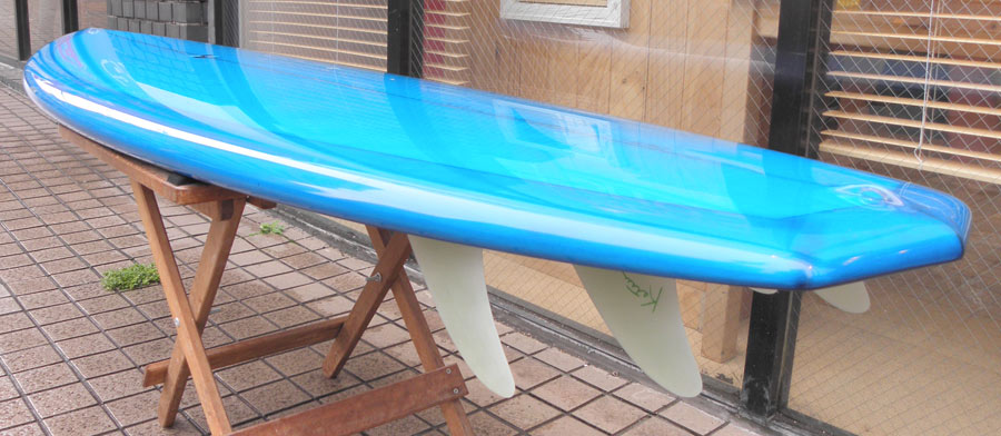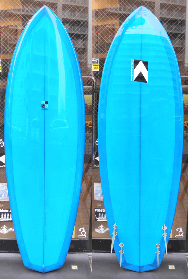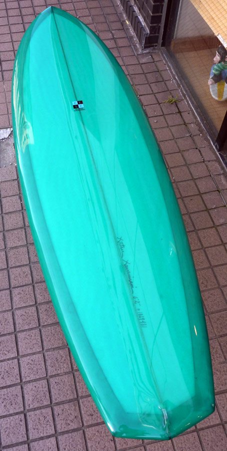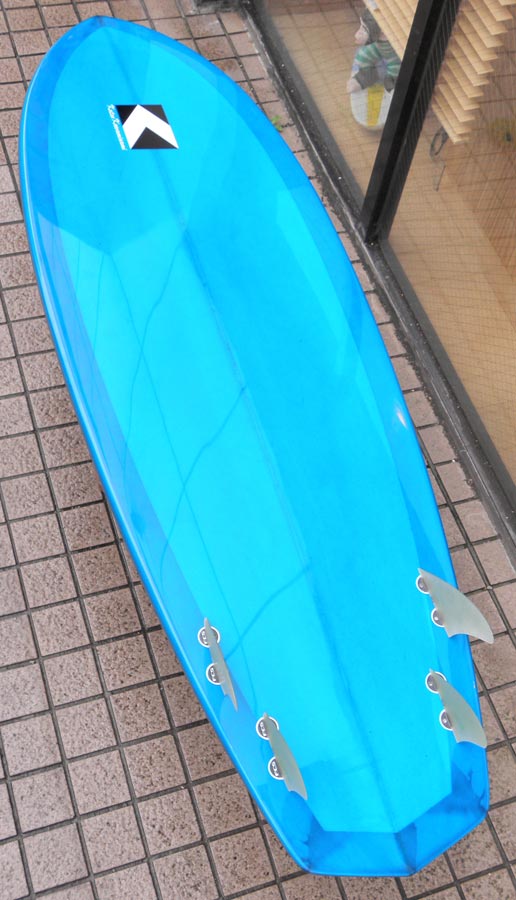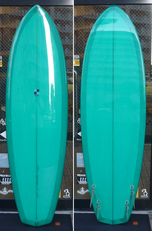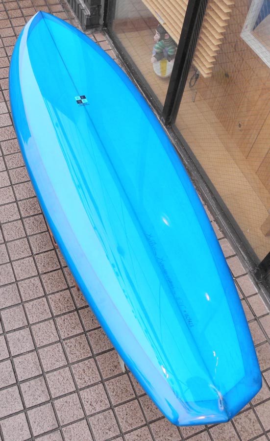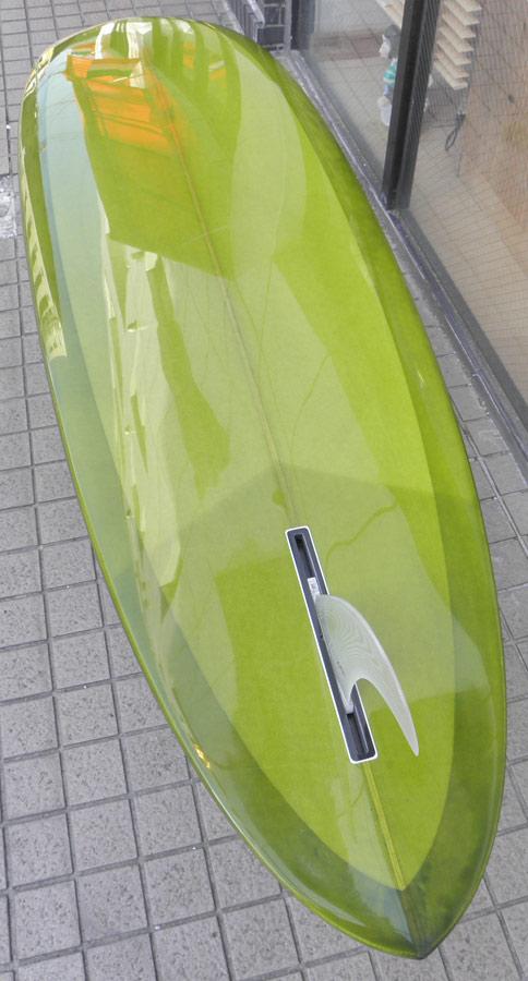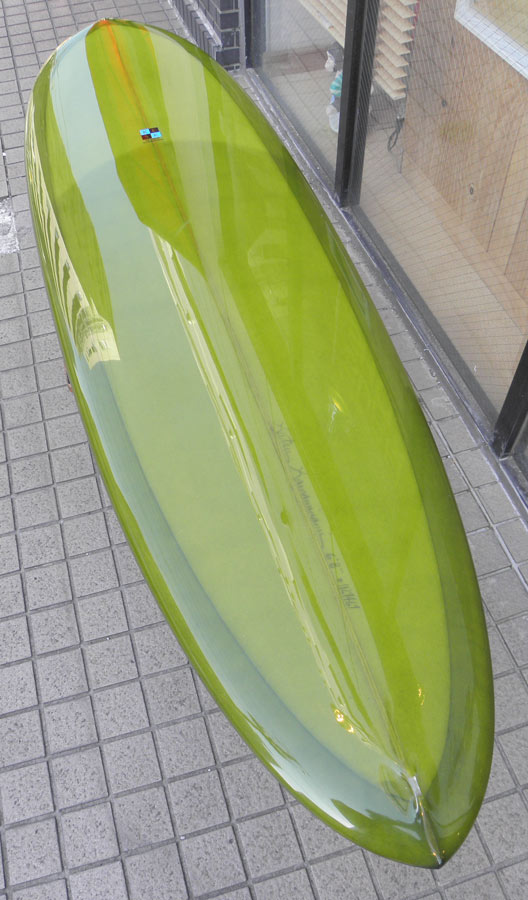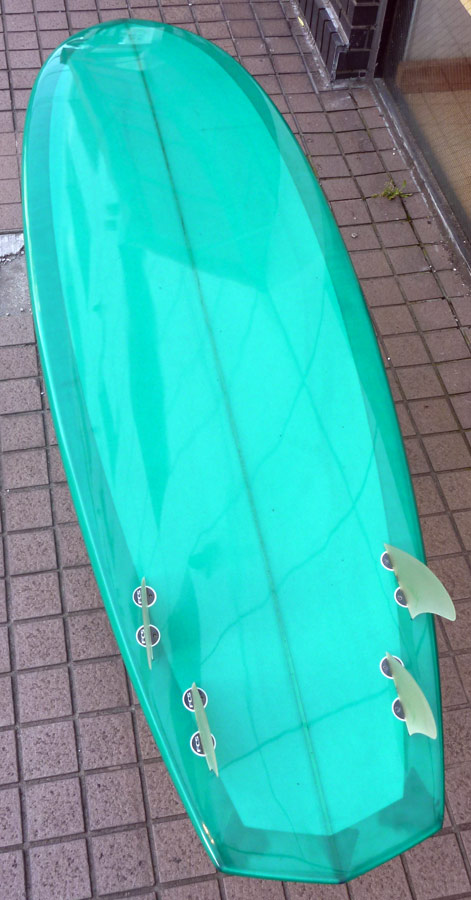レングスは、5’10”から作ることができます。フィンはクアッドの他、トライフィン、シングルなどお好みのスタイルで。浮力を増やしたい方、フィッシュライクな浮力とテイクオフで、フィッシュ以外のシェイプをお探しの方などにおすすめのシェイプです。ターコイズグリーンのティントカラーでラミネートしました。レングス、ワイド、厚みとカラー、ともにカスタムOKです。5’11”ホットマンゴークアッド シェイプ例