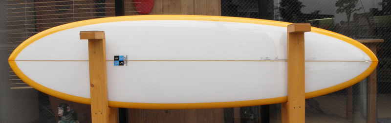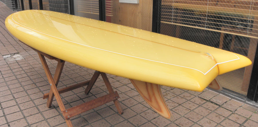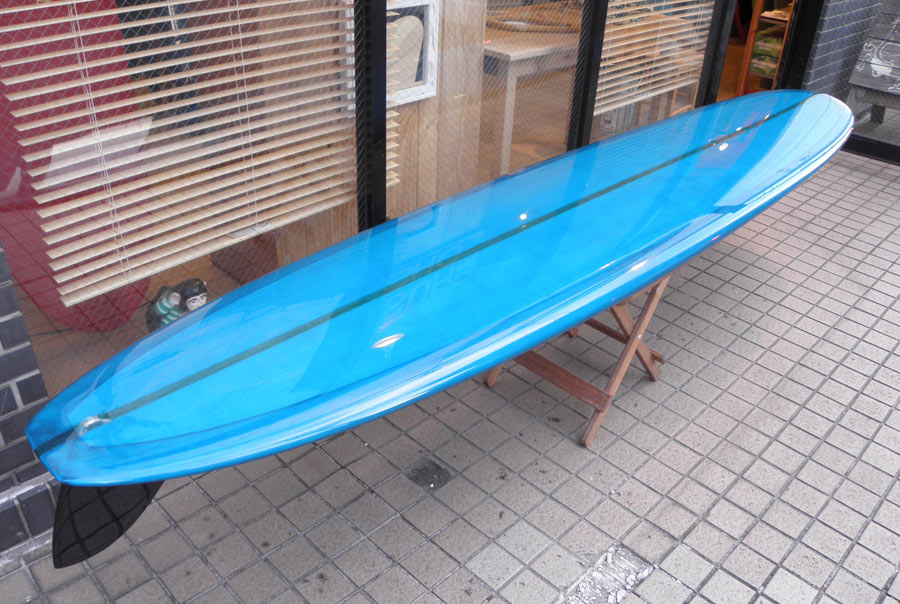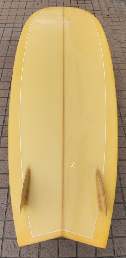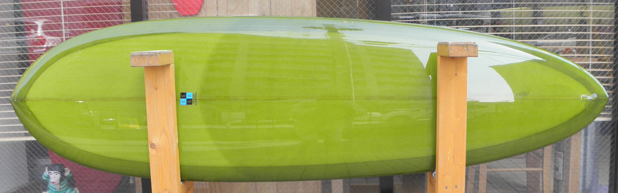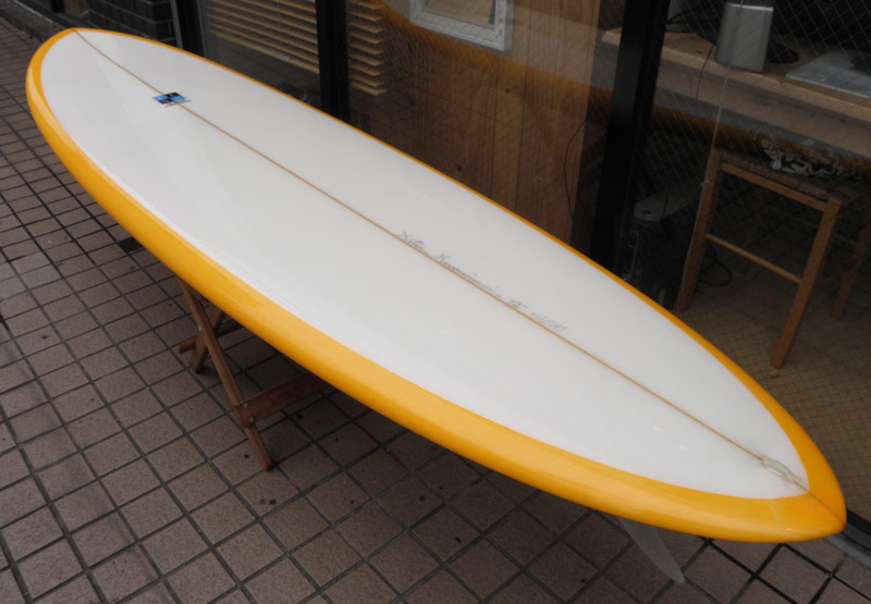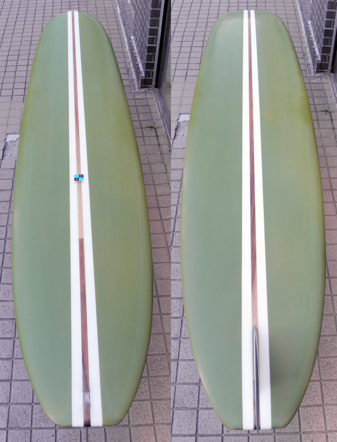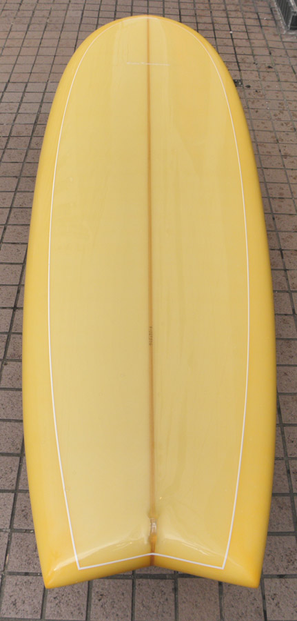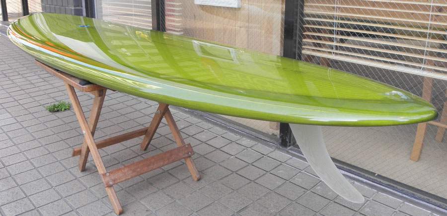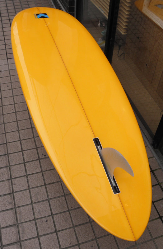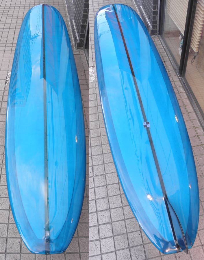 レングスは、5’10”から作ることができます。フィンはクアッドの他、トライフィン、シングルなどお好みのスタイルで。浮力を増やしたい方、フィッシュライクな浮力とテイクオフで、フィッシュ以外のシェイプをお探しの方などにおすすめのシェイプです。ターコイズグリーンのティントカラーでラミネートしました。レングス、ワイド、厚みとカラー、ともにカスタムOKです。5’11”ホットマンゴークアッド シェイプ例