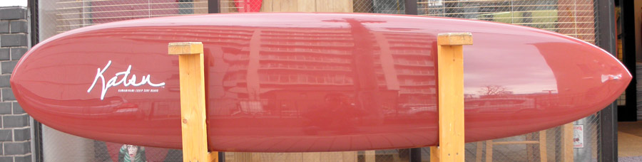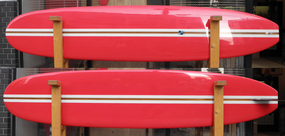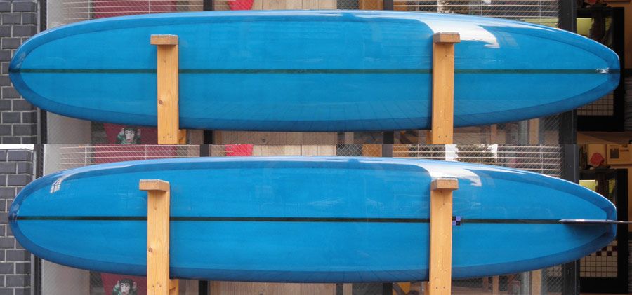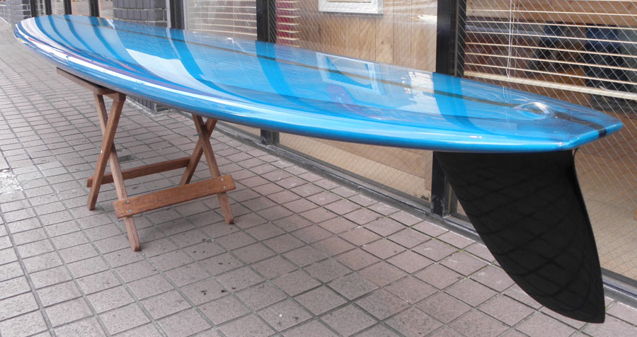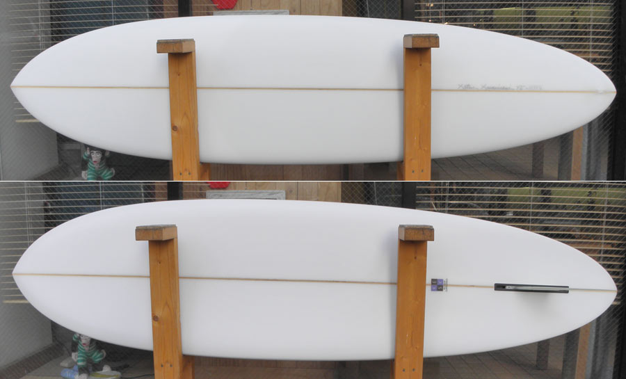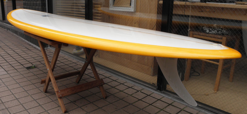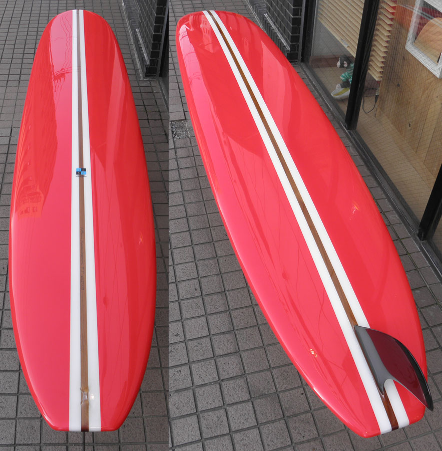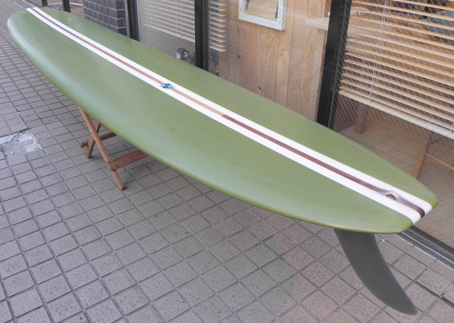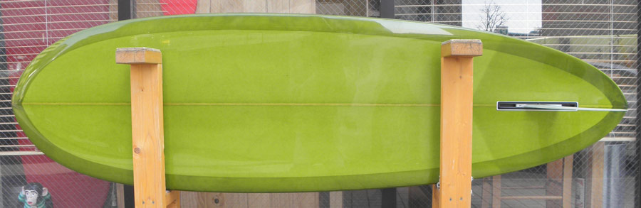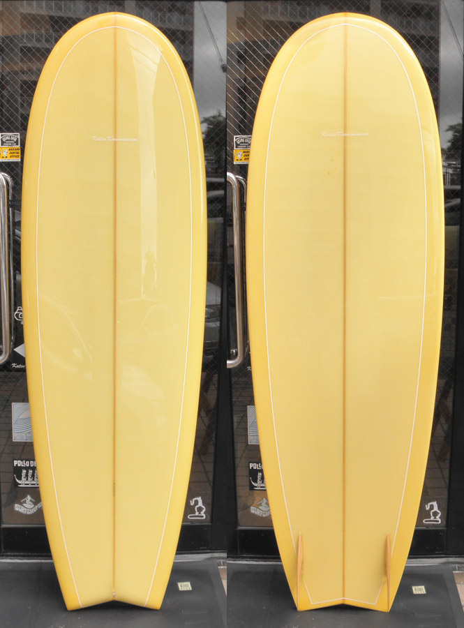 レングスは、5’10”から作ることができます。フィンはクアッドの他、トライフィン、シングルなどお好みのスタイルで。浮力を増やしたい方、フィッシュライクな浮力とテイクオフで、フィッシュ以外のシェイプをお探しの方などにおすすめのシェイプです。ターコイズグリーンのティントカラーでラミネートしました。レングス、ワイド、厚みとカラー、ともにカスタムOKです。5’11”ホットマンゴークアッド シェイプ例