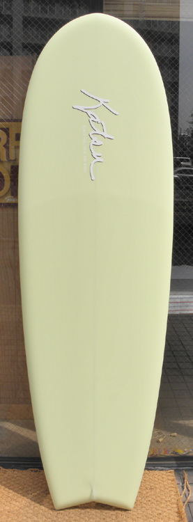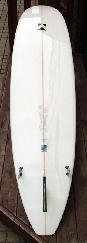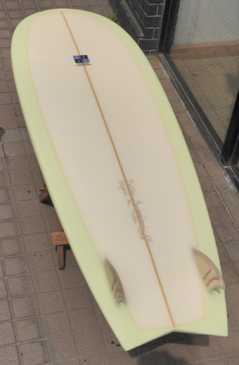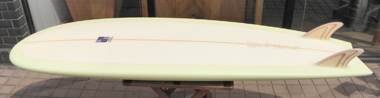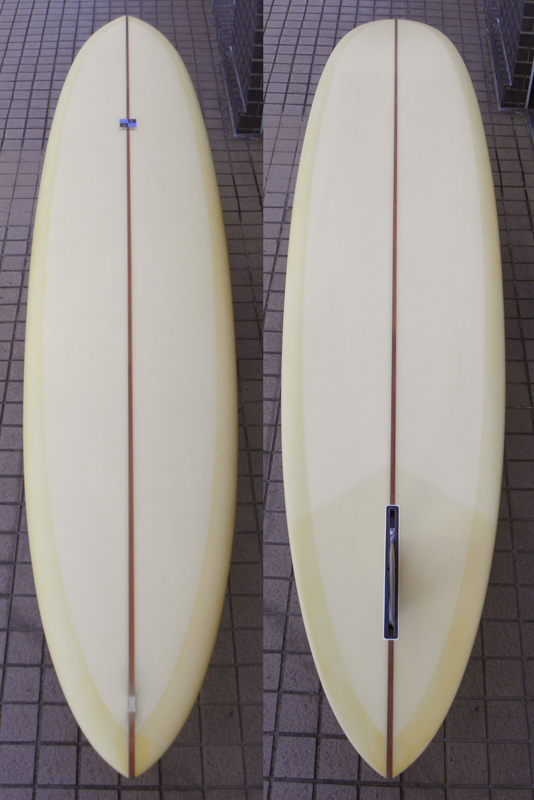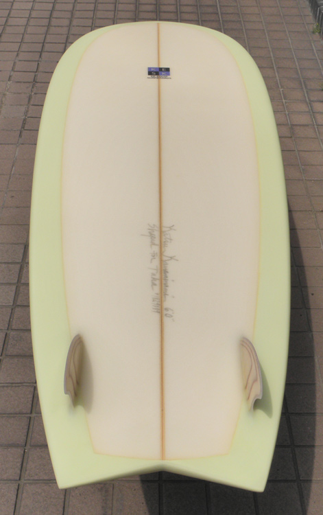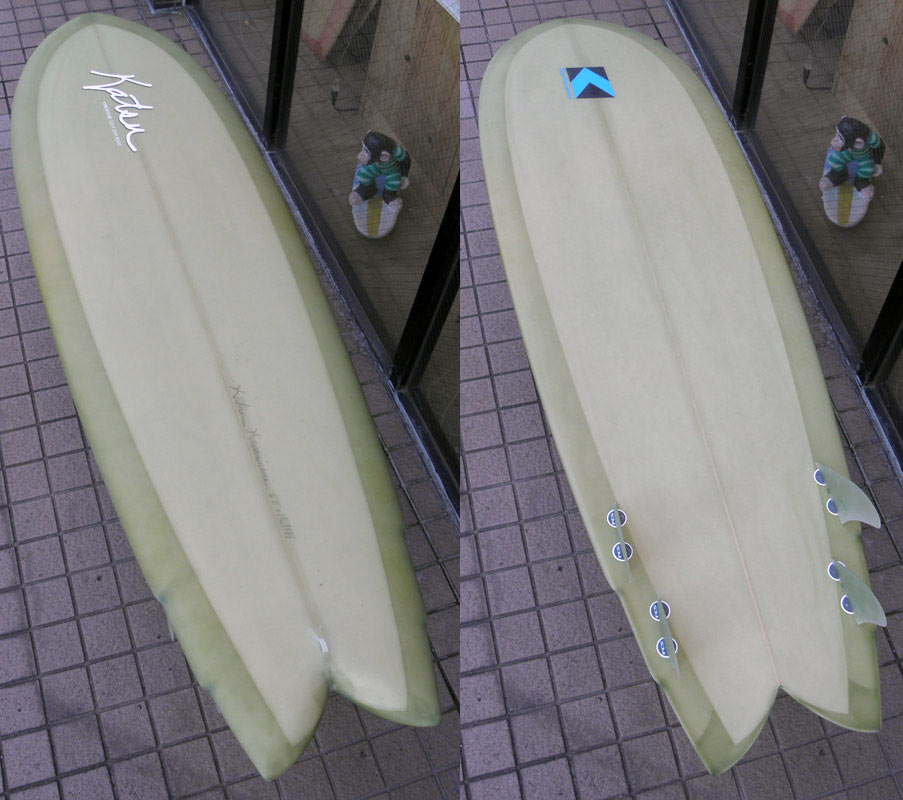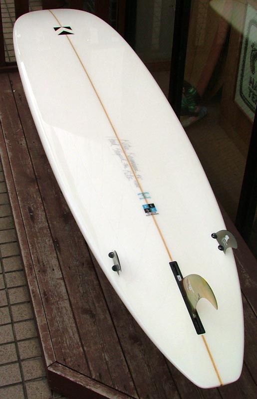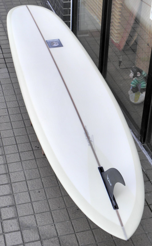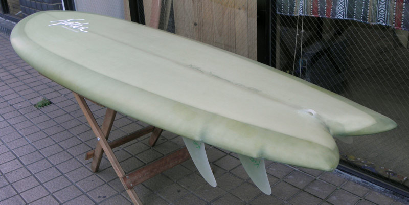 70年代初期、リノ・アベリラが鎌倉にもちこんだ超速フィッシュにインスパイアされて作られたツインフィンです。スピードを得るためのロッカー、ボトムのシェイプ、フィンの大きさ、取り付け角度、位置などは、試行錯誤を繰り返した結果のベストセッティングです。ボリュームがあるラウンドノーズは速いパドルとテイクオフを助け、マッシーな小波からサイズアップした波まで、スピードが付けやすくスムースなサーフィンを楽しめるツインフィンです。
