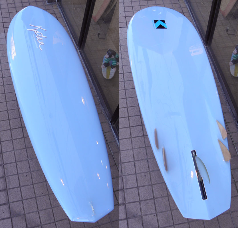 ハイパフォーマンス ミッドレングスボードがOKIDOKIモデルです。シェイパー川南活のお気に入りのモデルのひとつで、ショートムービー「LET IT ROLL」の中で、逗子のリーフの波やフランスのギタリーで乗っているボードがこのOKIDOKIです。フィンはトライフィン、サイズレンジは、7’6”~8’4”でお作ります。映像のように大きな波でもよく機能しますが、浮力が多くフレンドリーなシェイプですので初心者や、ロングボーダーにもお勧めできるモデルです。