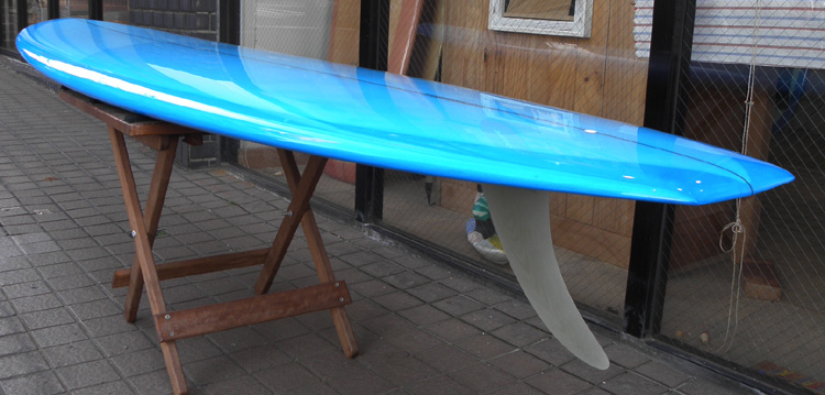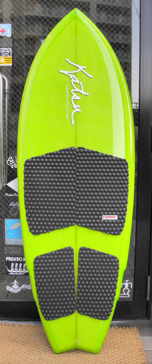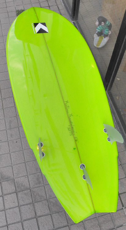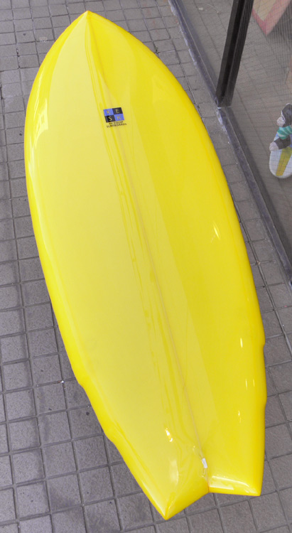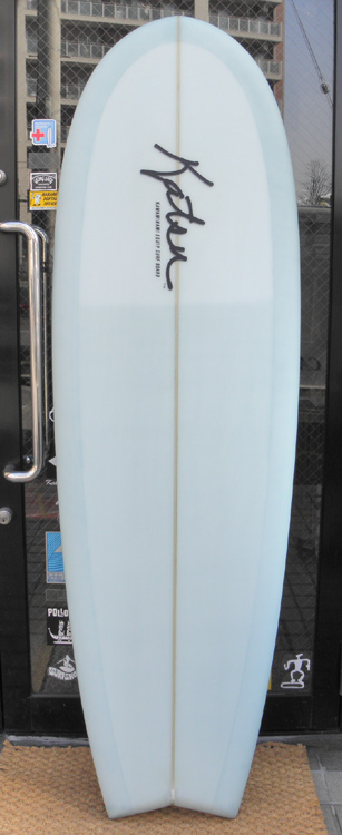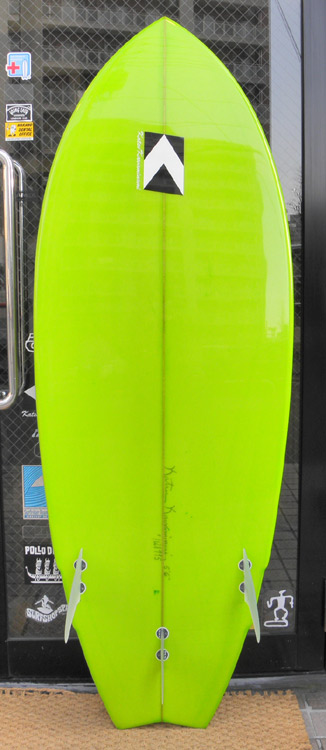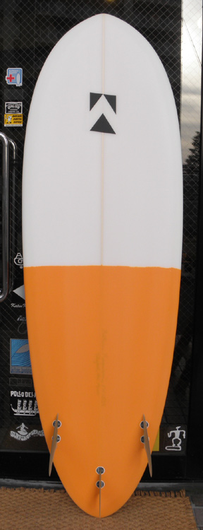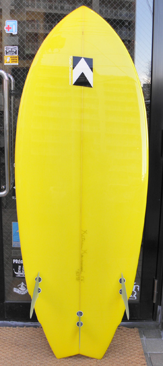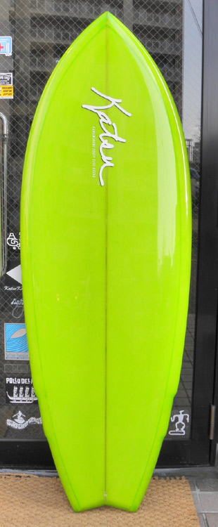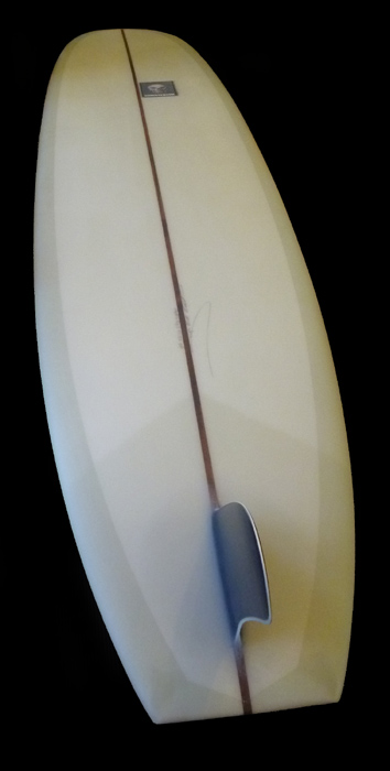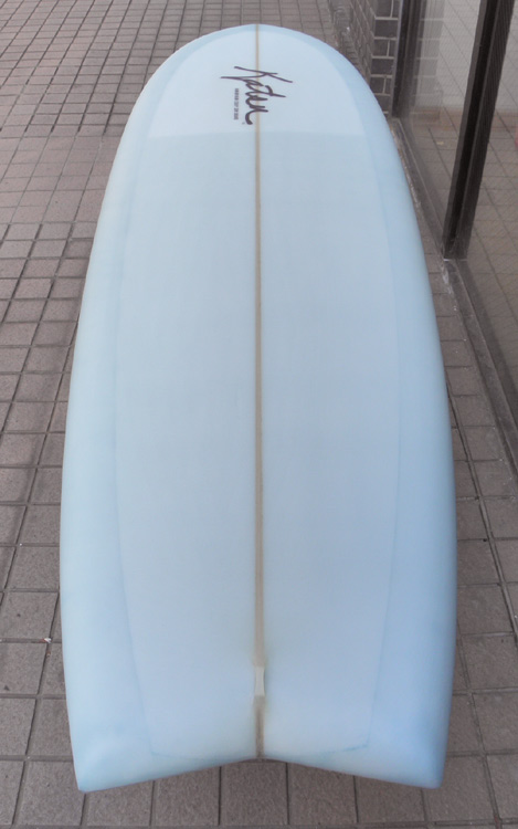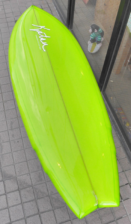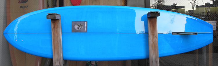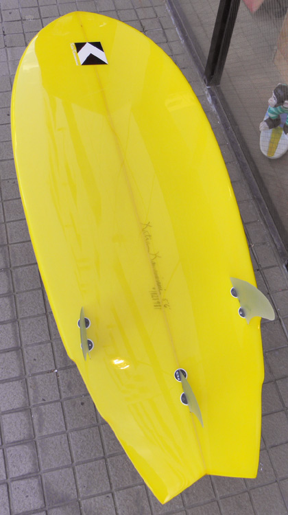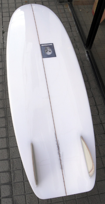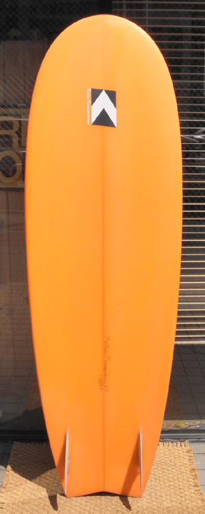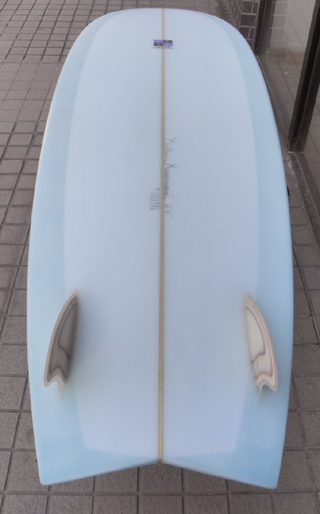 70年代初期、リノ・アベリラが鎌倉にもちこんだ超速フィッシュにインスパイアされて作られたツインフィンです。スピードを得るためのロッカー、ボトムのシェイプ、フィンの大きさ、取り付け角度、位置などは、試行錯誤を繰り返した結果のベストセッティングです。ボリュームがあるラウンドノーズは速いパドルとテイクオフを助け、マッシーな小波からサイズアップした波まで、スピードが付けやすくスムースなサーフィンを楽しめるツインフィンです。