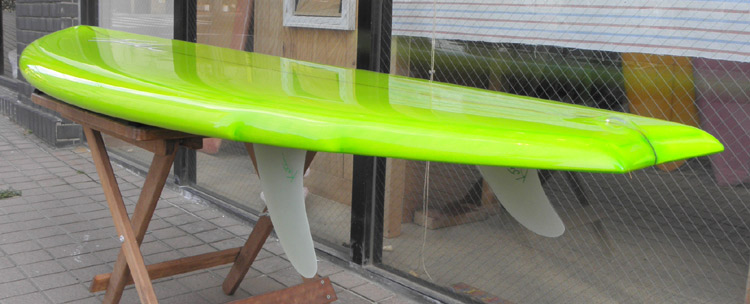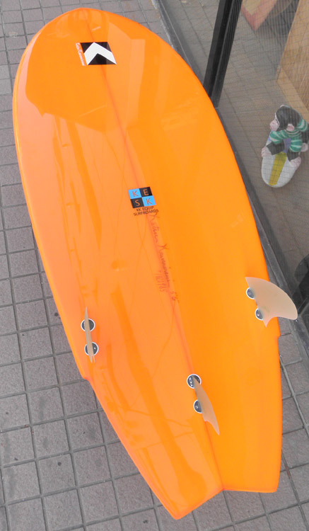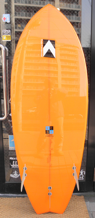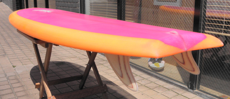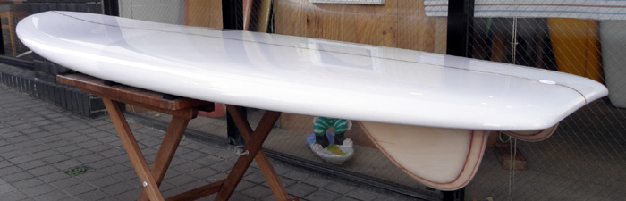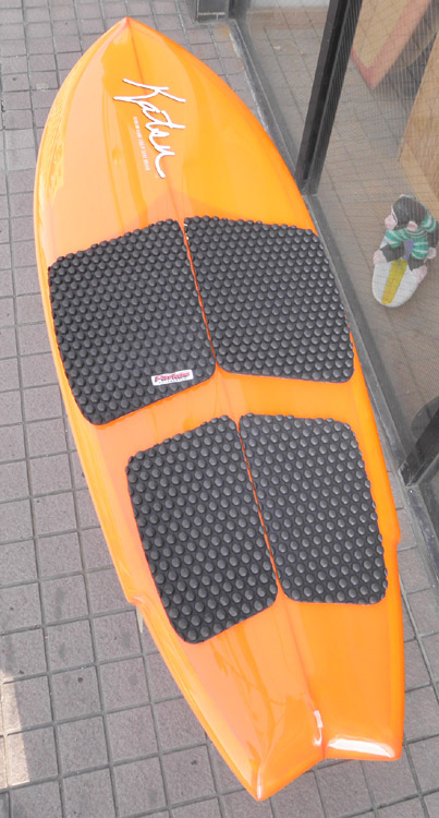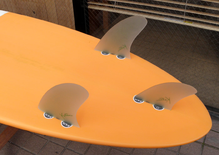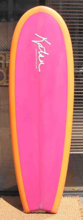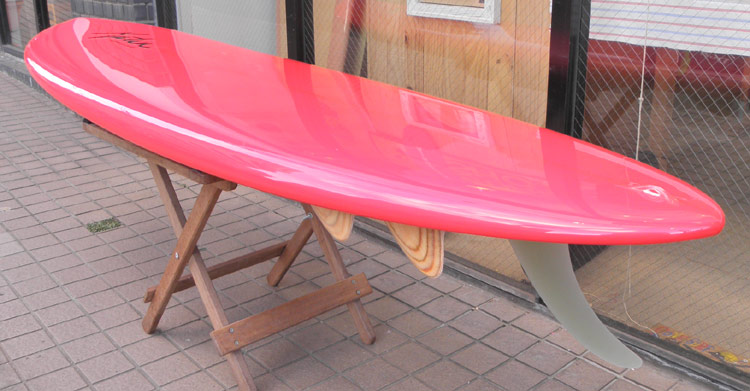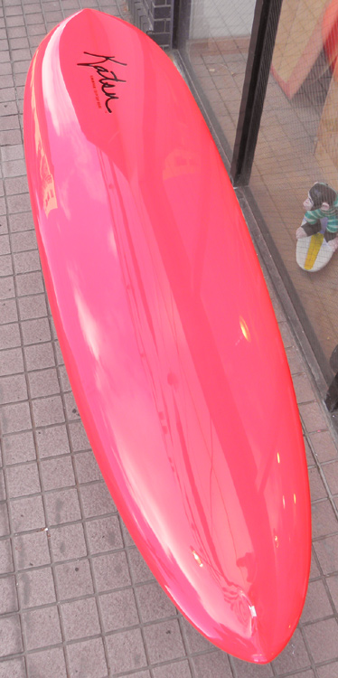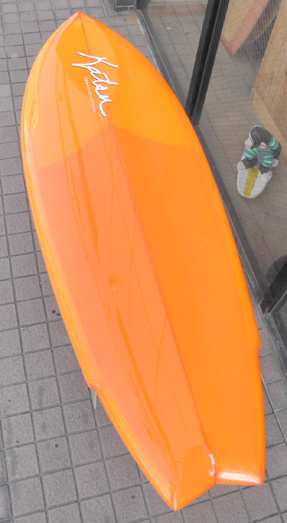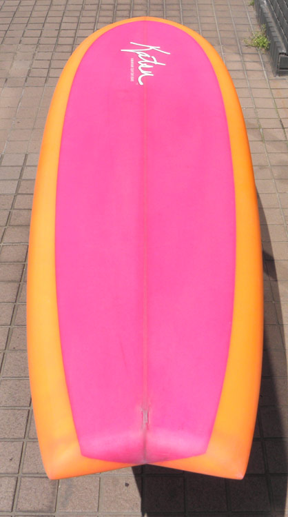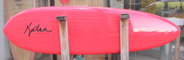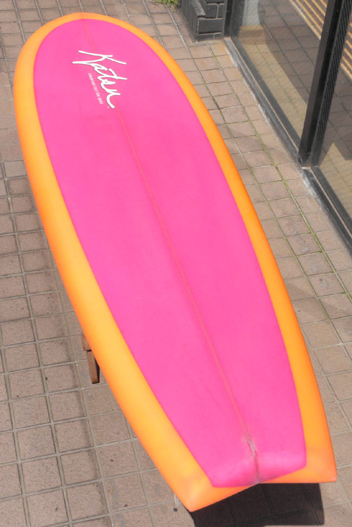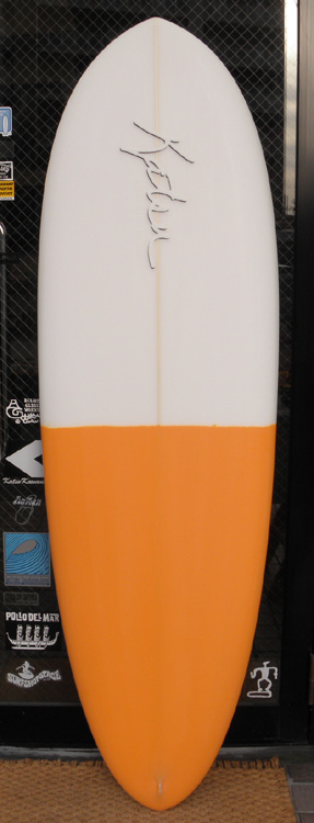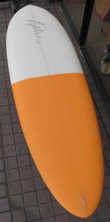 カツカワミナミサーフボードのニーボードです。ニーは膝。ボードの上に立ち上がらずに膝立ちで真っ直ぐ正面を向いて乗るためのサーフボードです。幅が広くずんぐりしたアウトラインからは想像できないクィックな動きとドライブ感、そしてスピード感を楽しめるのがニーボードの大きな魅力です。このボードはきれいなオレンジ色のティントカラーでラミネートされ、補強に追加したクロスがデッキのアクセントになっています。フィンはツインスタビライザー。カツさんオリジナルのグラスフィンはニーボード独特の位置に取り付けられています。コシ前後の小さい波から台風の波まで、オールラウンドに使えるモデルです。