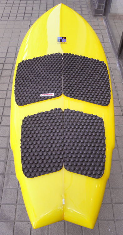 カツカワミナミサーフボードのニーボードです。ボードの上に立ち上がらずに膝立ちで乗るためのサーフボードです。幅が広くずんぐりしたアウトラインからは想像できないクィックな動きとドライブ感、そしてスピード感を楽しめるのがニーボードの大きな魅力です。きれいなイエローティントに仕上がっているこのボードは、スワローテールにフィンはツインスタビライザーです。コシ前後の小さい波から台風の波まで、オールラウンドに使えるモデルです。トライフィン仕様もお作りすることができます。