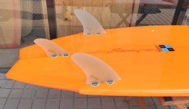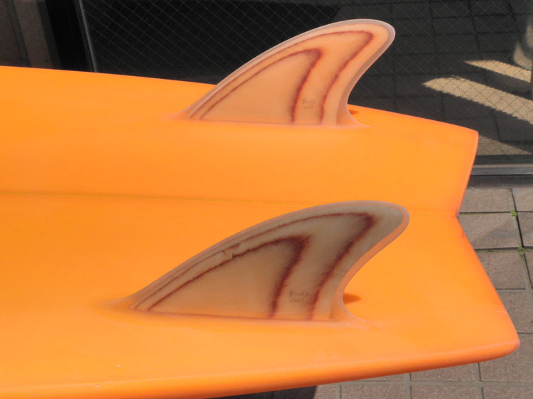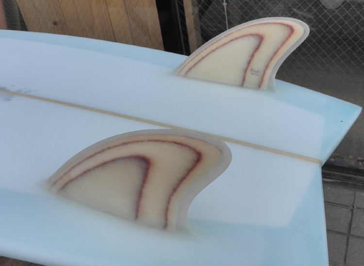 ダブルフォイルされたマリンプライウッドのツインフィンがグラスオンされます。