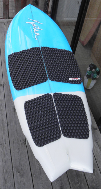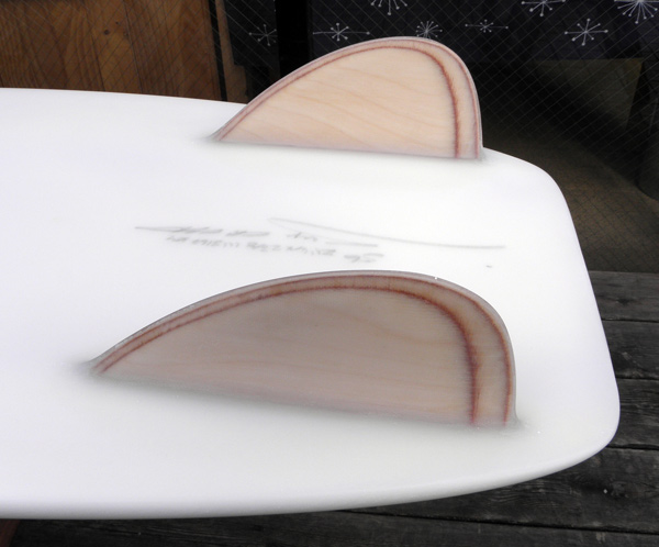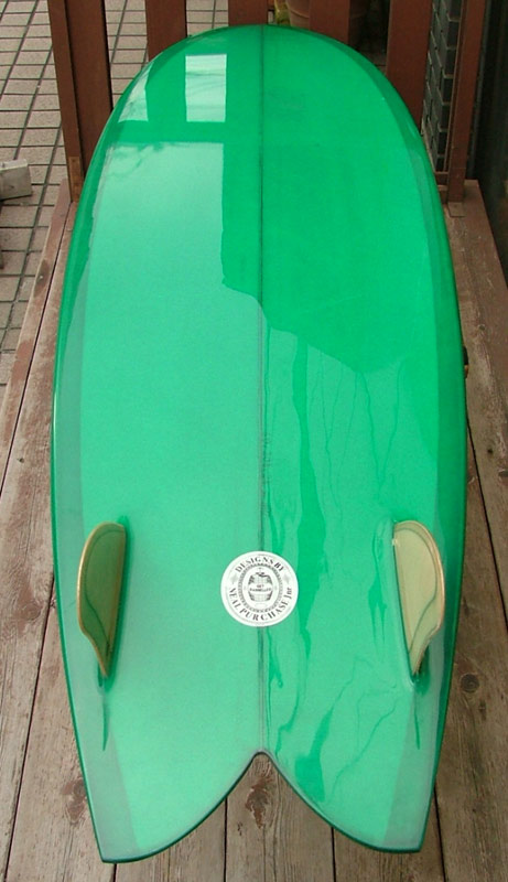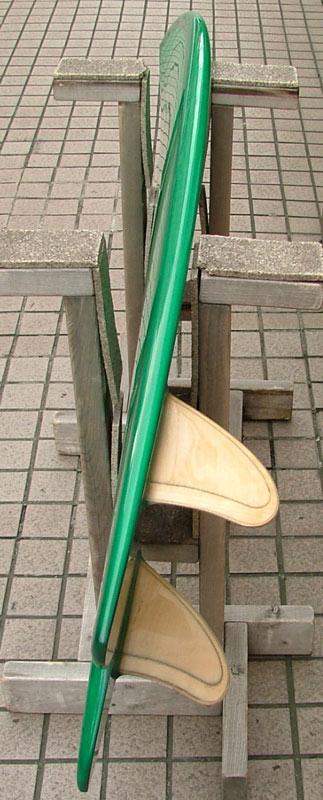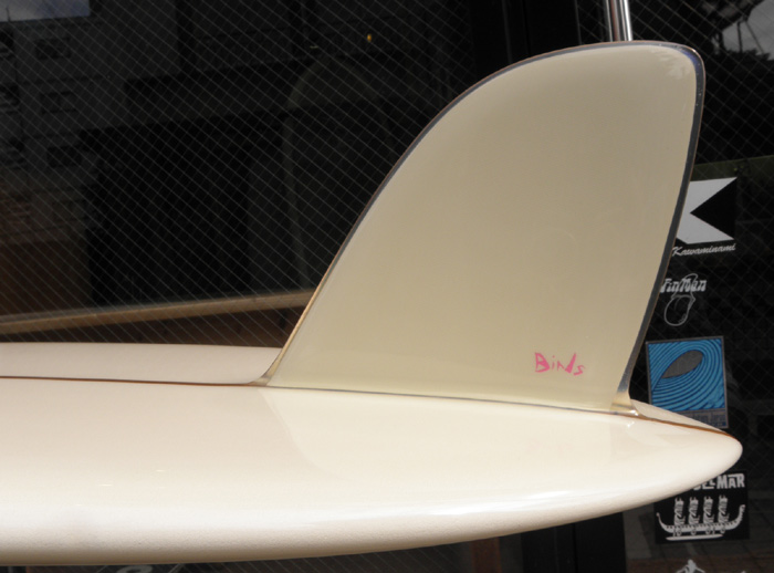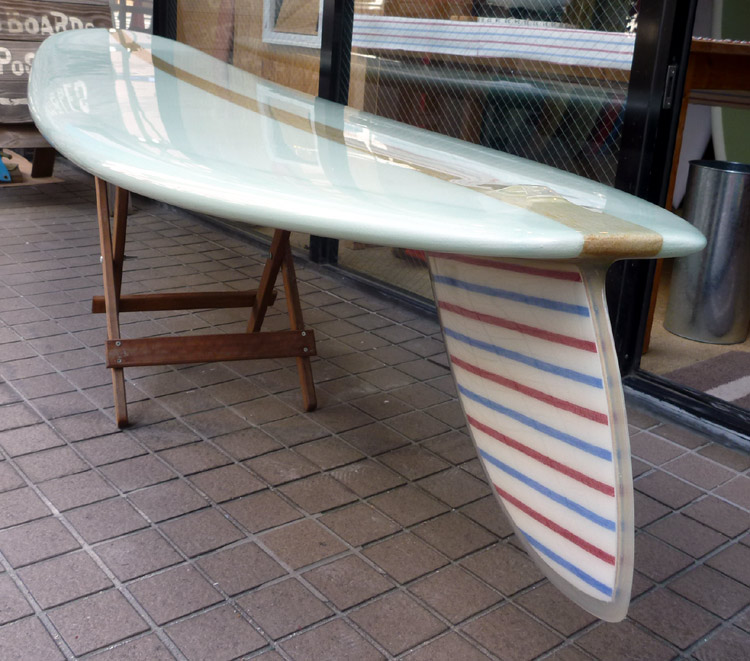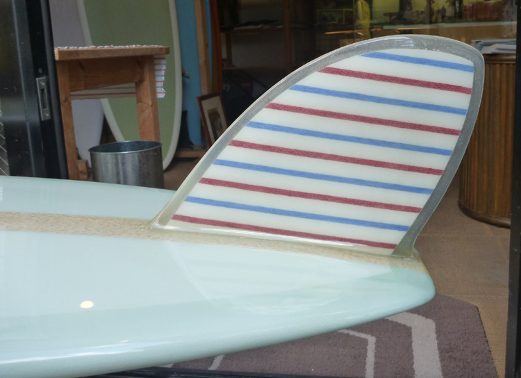フィンはボーダー柄のクロスをラミネートして作りました。フィンのカラーや柄などのデザイン、ご相談に乗ります。