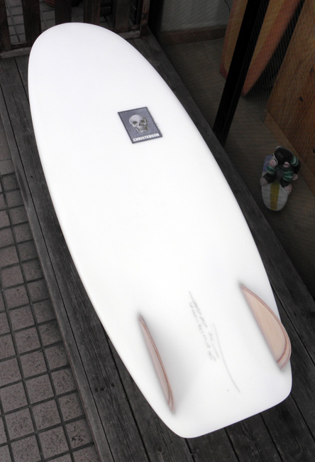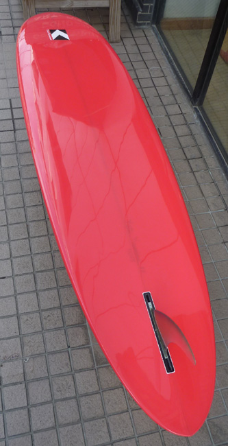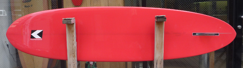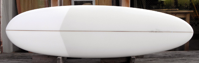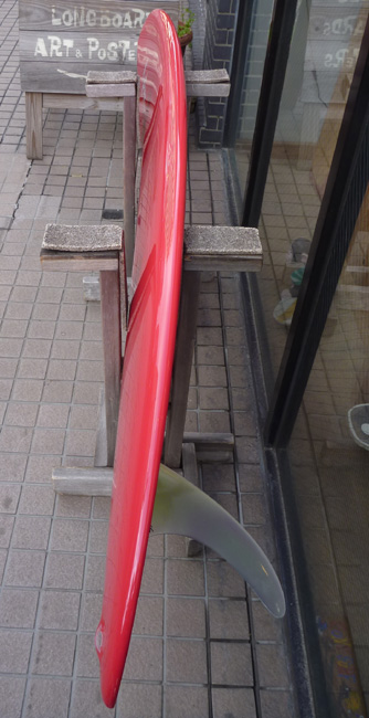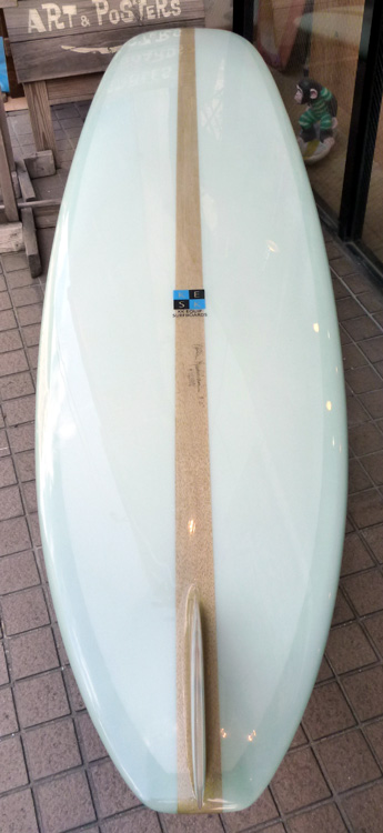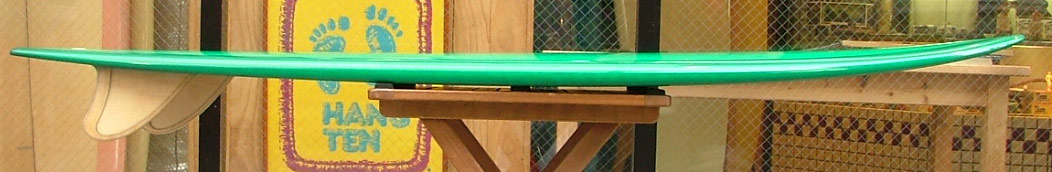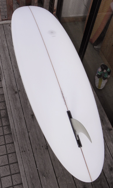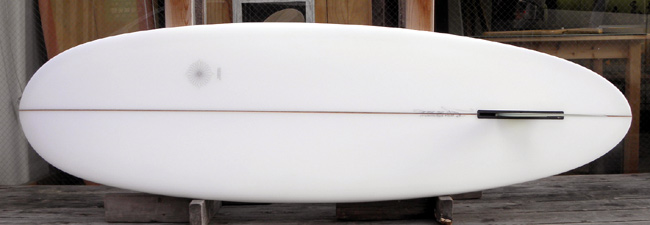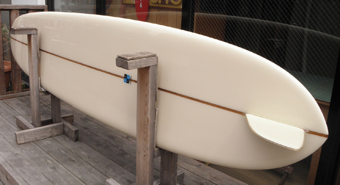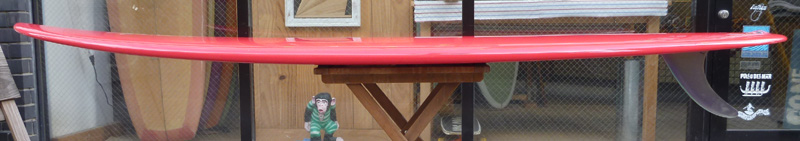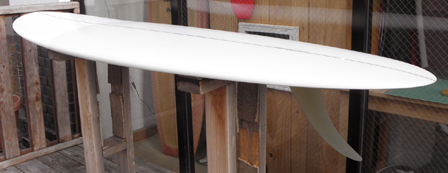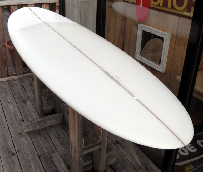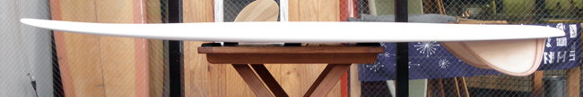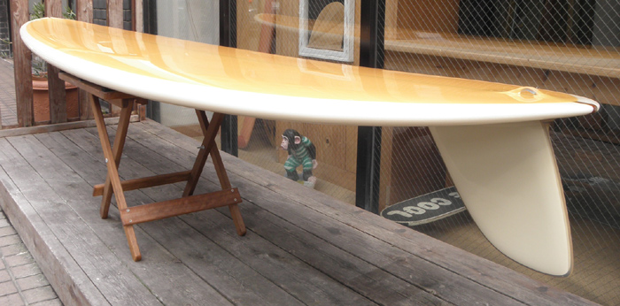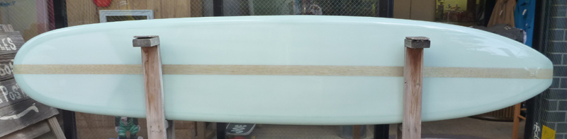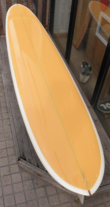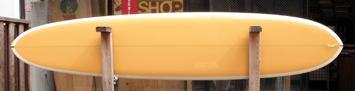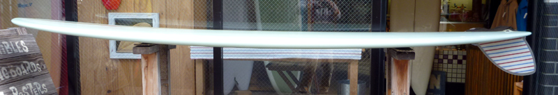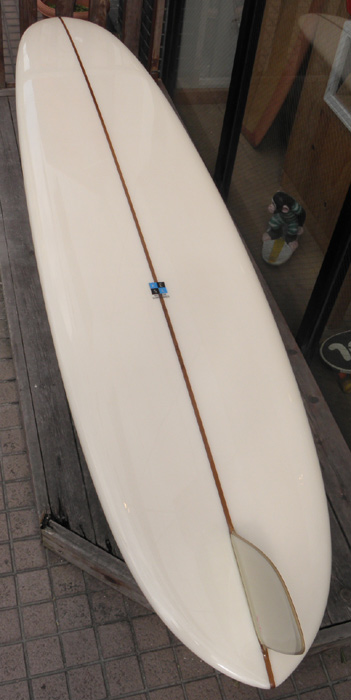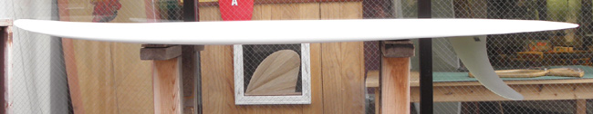 1960年代の前半に主流のデザインだったPIGと呼ばれるサーフボードデザインをもとにカスタムビルドしたロングボードです。テール寄りにおかれたボリュームと絞り気味のポイントノーズが特徴で、ホットドギングと呼ばれるロングボードならではの動きがあるスタイリッシュなマニューバを楽しむためのクラシックスタイルのロングボードです。レールは60/40のソフトレール。幅を広めに取ったテールには軽くキックを入れています。テール近くにDフィンタイプのクラシカルなフィンをグラスオンしました。