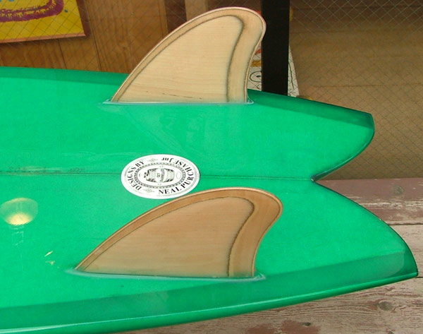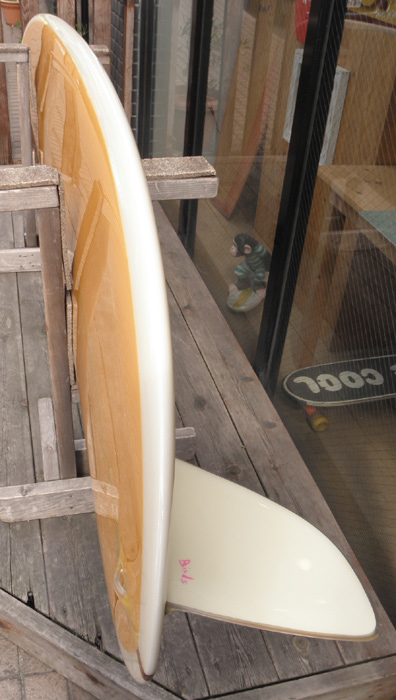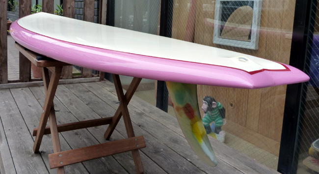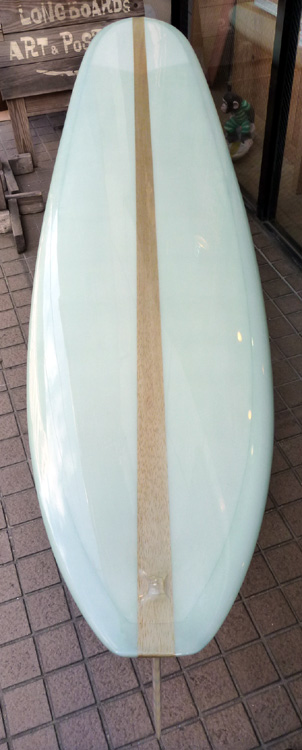 川南活さんシェイプのPIGです。2インチワイドのバルサストリンガーに高密度発泡のフォームを使用しています。ラミネートも厚く巻いているのでクラシックボードらしいしっかりとした重量があります。レールはPIGの丸いボールレールを再現し、ボトムも全体にわたって強いロールボトムです。フィンはDフィンテンプレットにクロスをラミネートしてグラスオンしました。60年代のホットドギングというクラシックなマニューバをイメージして作ったボードです。