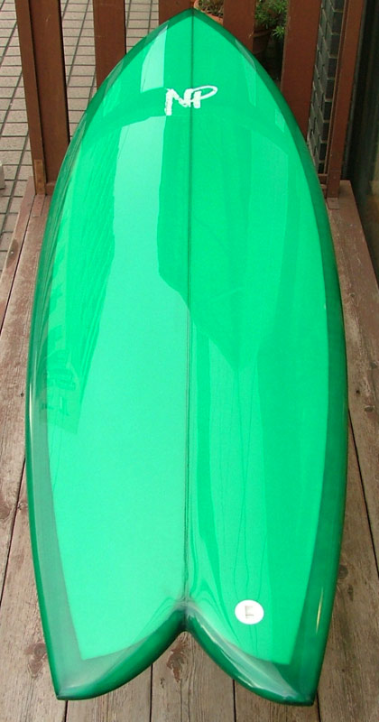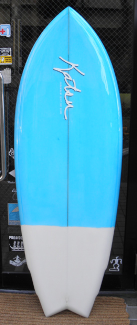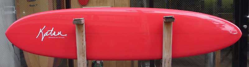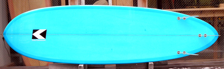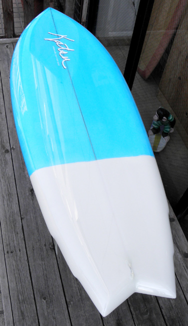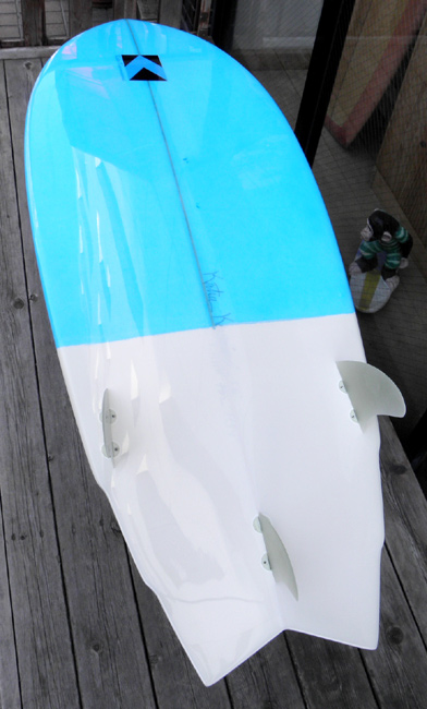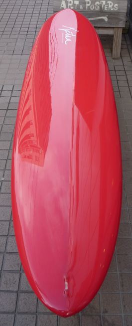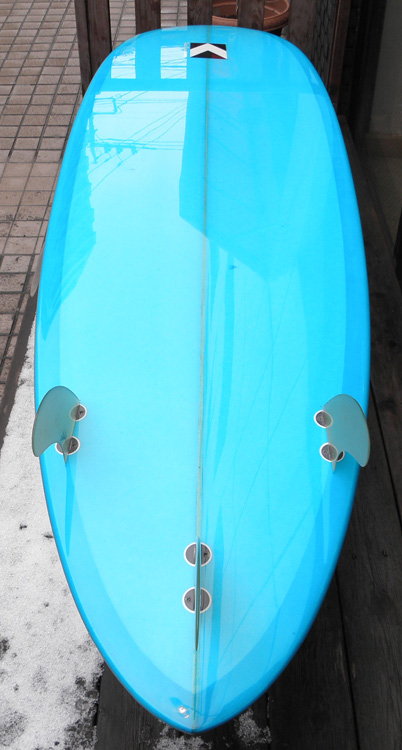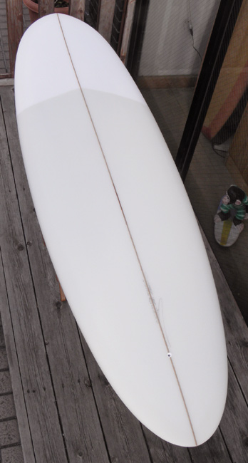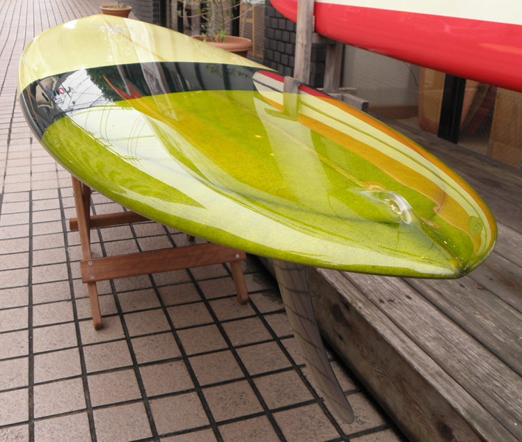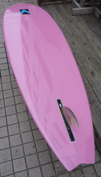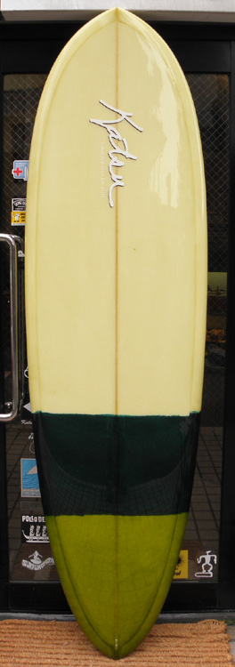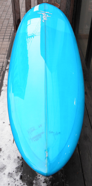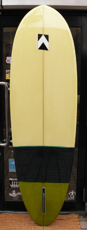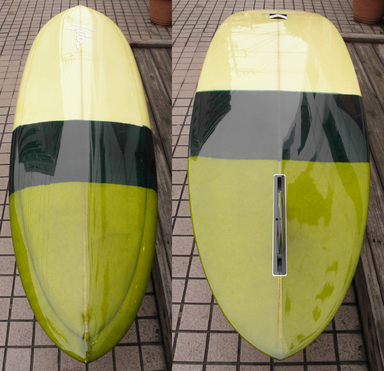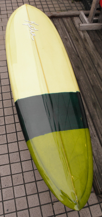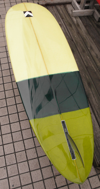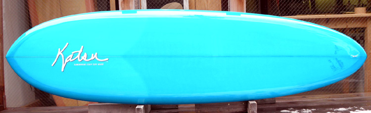 カツカワミナミサーフボードの人気モデルMINIです。長さは基本の6’8”ですがご希望に合わせて、全体的に薄めにシェイプしました。フィンはシングルフィン。テールエリアにエッジを効かせてダブルコンケーブを入れることによって、スピードを付けやすくシングルフィンでも動かしやすくカスタムしました。カラーは三色のティントで塗り分け。ご希望通りのカラーリングに仕上がっています。
