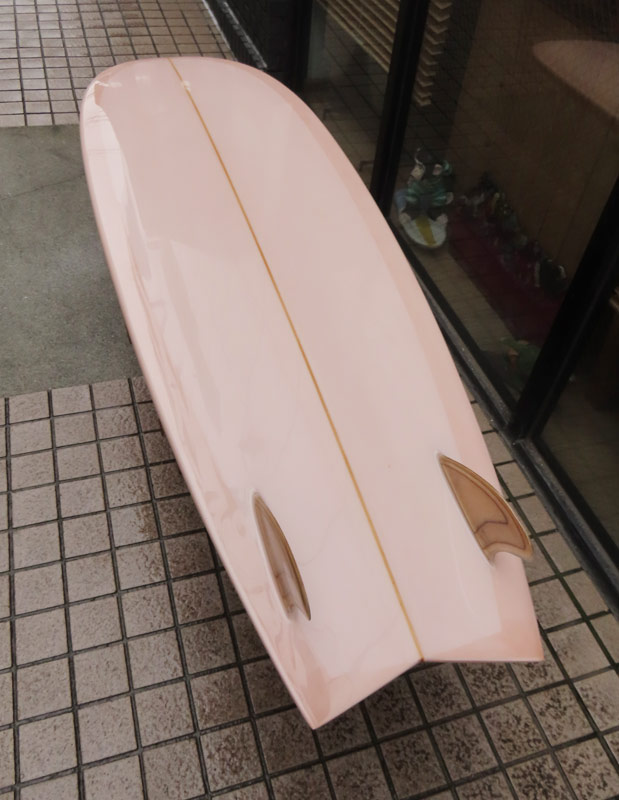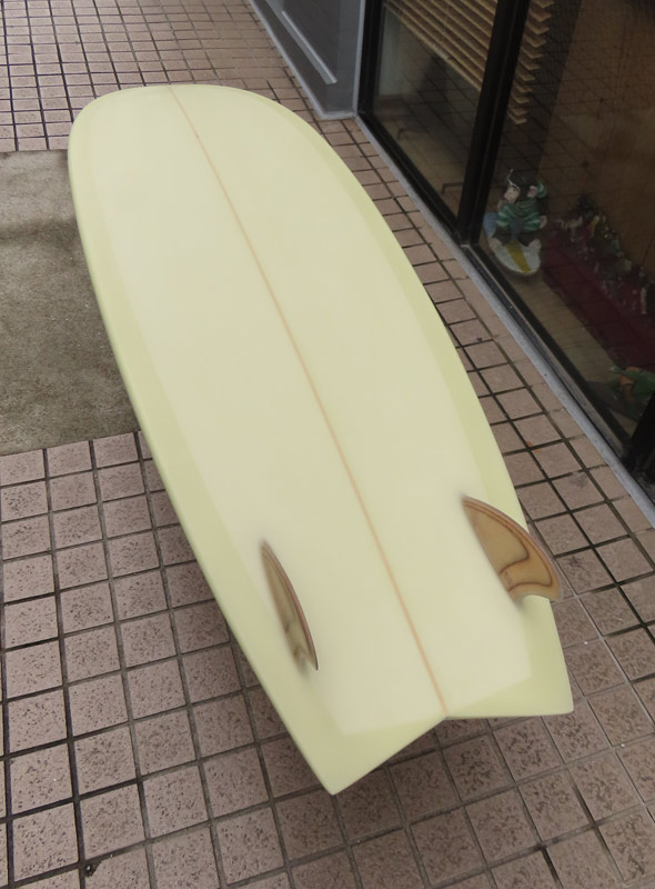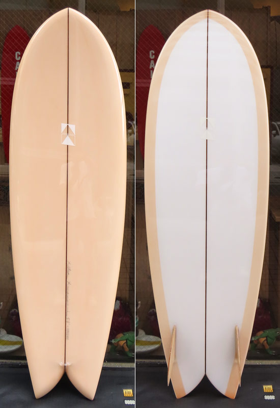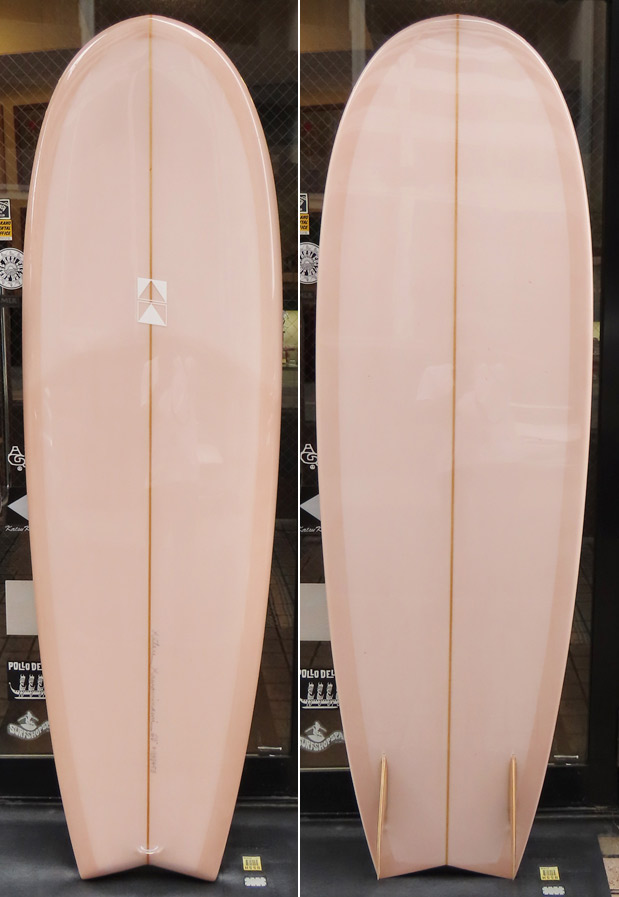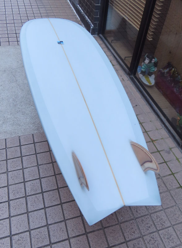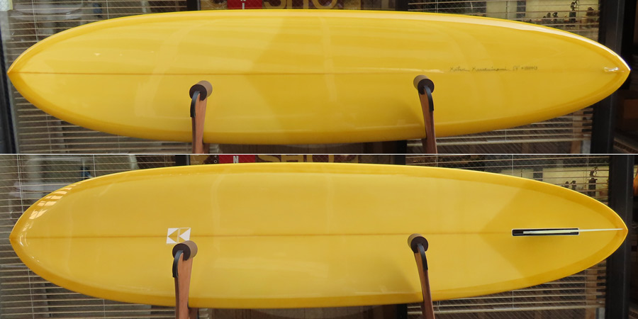 カツカワミナミサーフボード KK FISHです。パドルがイージーでテイクオフが速いラウンドノーズと絞り気味のテールが特徴のフィッシュモデルです。前方寄りのバランスはスピードを付けやすく、絞り気味のテールとシングルフォイルのフィンでコントロール性が高いセッティングになっています。フラットデッキとダウンレールの組み合わせはクラシカルな雰囲気です。ファンな外観ですが、サイズアップした波も楽しめるポテンシャルを持っています。カツカワミナミサーフボードのラインアップの中でも20年以上の歴史がある、根強い人気があるフィッシュモデルです。