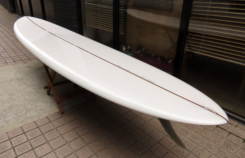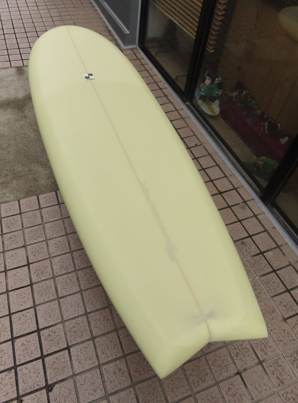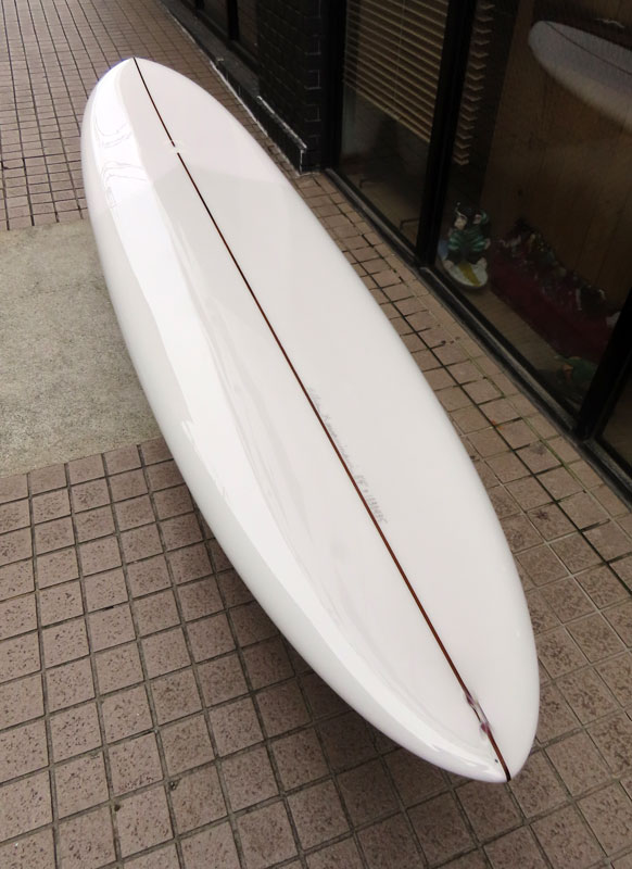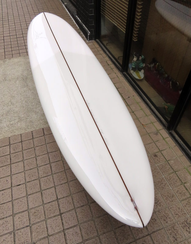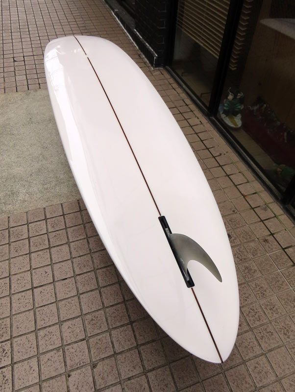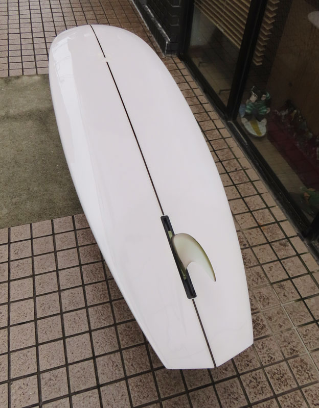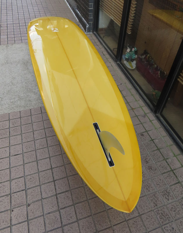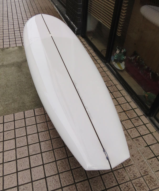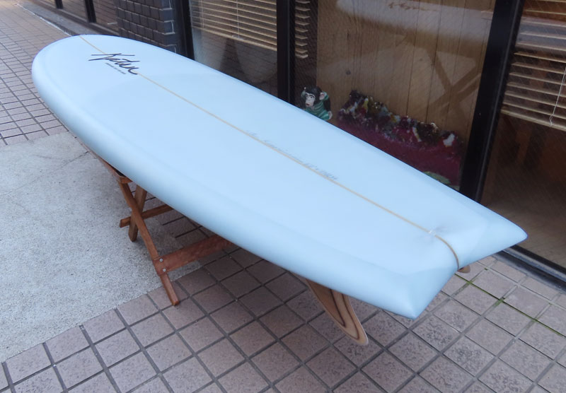 カツカワミナミサーフボード TOTO のミッドレングスボードです。ボリュームがあるエッジが効いたダウンレールとボトムはフラット~VEEのシェイプです。シンプルなフラットボトムですが、よりスムースに滑らせるためにシェイパーの手が入っているフラットボトムは「’KATSU’フラット」とでも呼べる特別なボトムです。センターにたっぷりと厚みを持たせたシェイプで、ワンサイズ上のサイズのボードと同様の速い滑り出しです。テールのVEEで動きは軽く、プリモのトライプレーンコンボボトムとは違う感触のサーフィンが楽しめます。