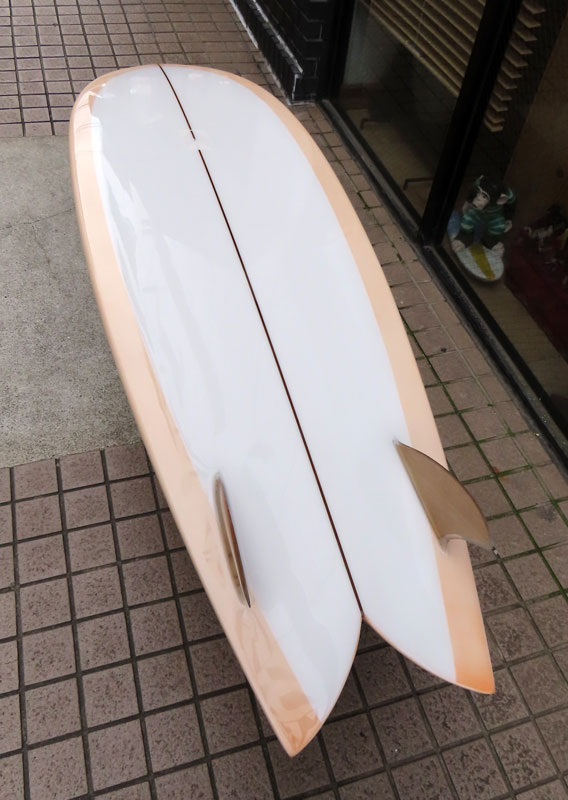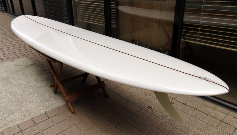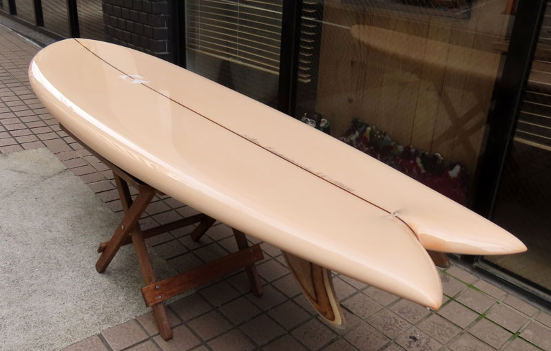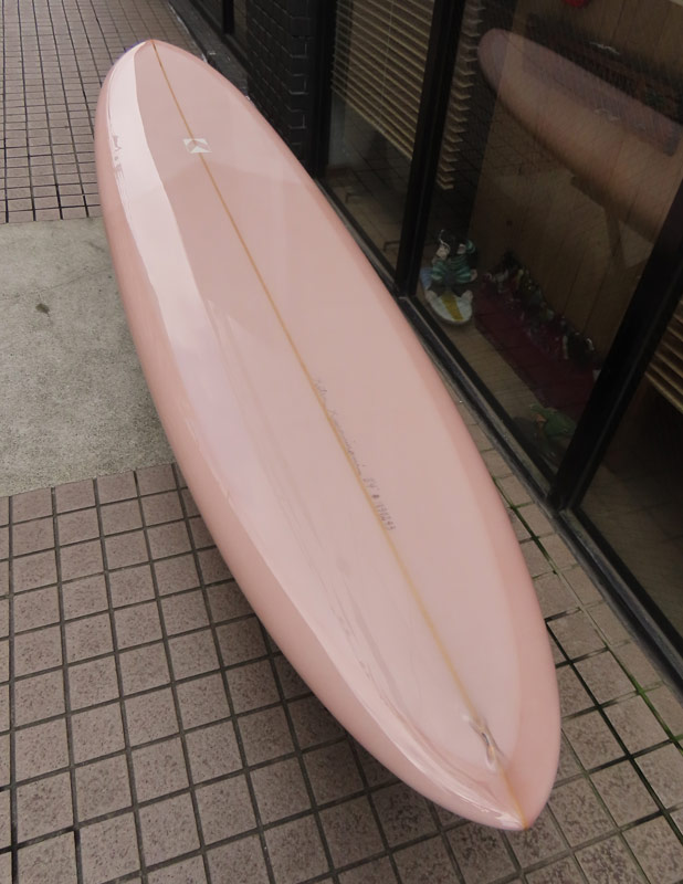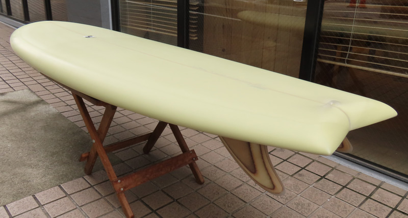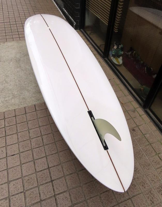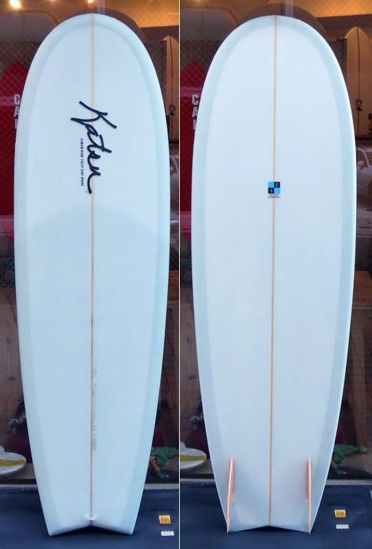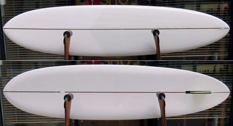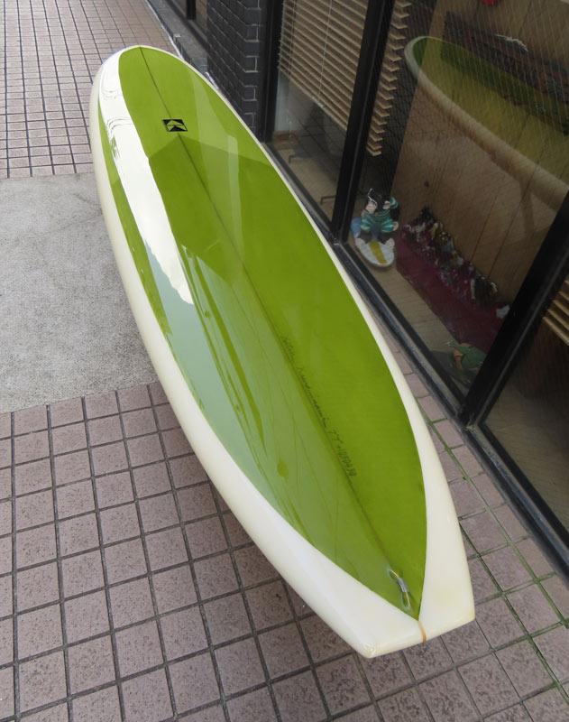 カツカワミナミサーフボード TOTO のミッドレングスボードです。ボリュームがあるエッジが効いたダウンレールとボトムはフラット~VEEのシェイプです。シンプルなフラットボトムですが、よりスムースに滑らせるためにシェイパーの手が入っているフラットボトムは「’KATSU’フラット」とでも呼べる特別なボトムです。センターにたっぷりと厚みを持たせたシェイプで、ワンサイズ上のサイズのボードと同様の速い滑り出しです。テールのVEEで動きは軽く、プリモのトライプレーンコンボボトムとは違う感触のサーフィンが楽しめます。