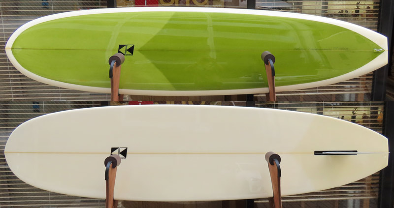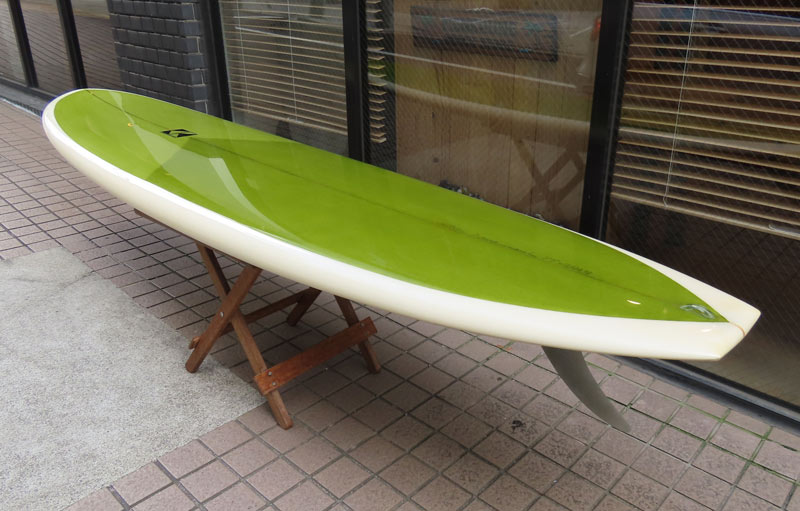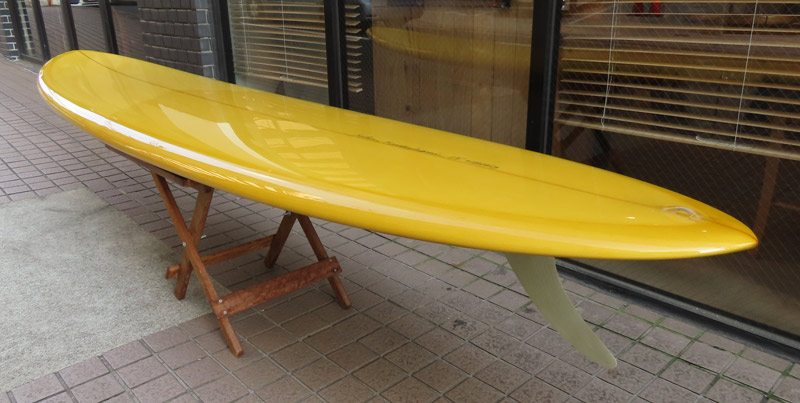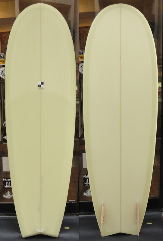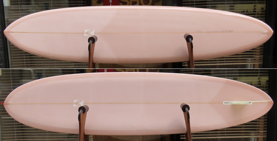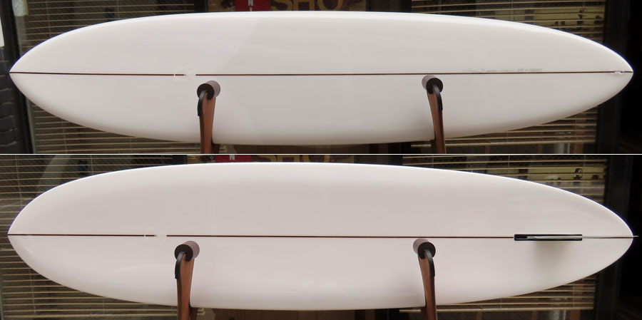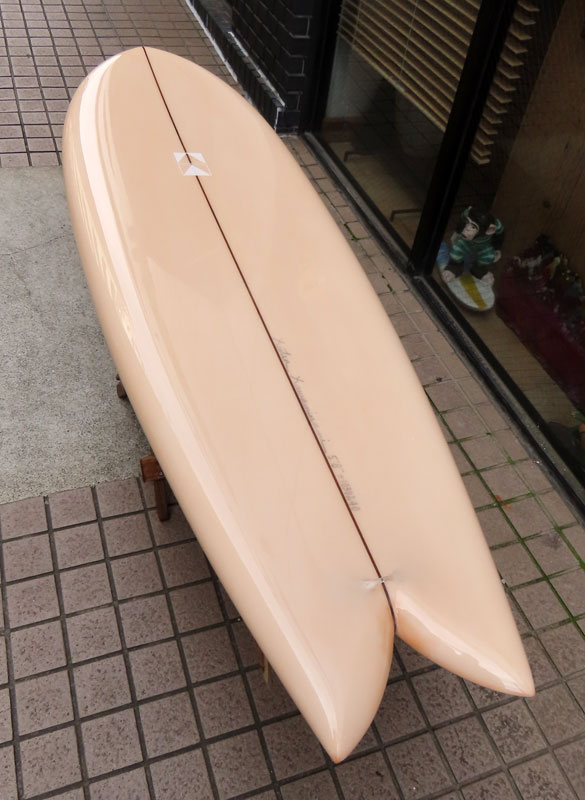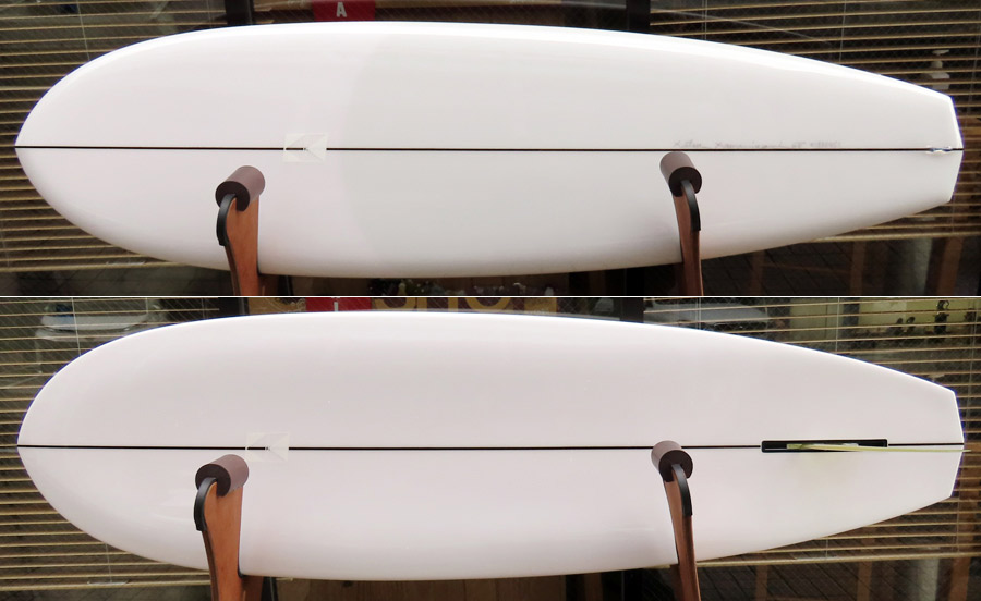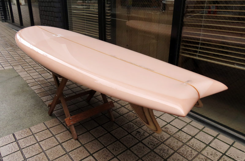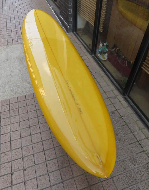 カツカワミナミサーフボード TOTO のミッドレングスボードです。ボリュームがあるエッジが効いたダウンレールとボトムはフラット~VEEのシェイプです。シンプルなフラットボトムですが、よりスムースに滑らせるためにシェイパーの手が入っているフラットボトムは「’KATSU’フラット」とでも呼べる特別なボトムです。センターにたっぷりと厚みを持たせたシェイプで、ワンサイズ上のサイズのボードと同様の速い滑り出しです。テールのVEEで動きは軽く、プリモのトライプレーンコンボボトムとは違う感触のサーフィンが楽しめます。