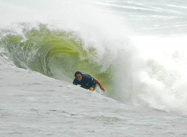 こんな波にも…使用ボードはいずれもミニモデルのトライフィンです。 Rider:KATSU KAWAMINAMI photo by M.Aoki