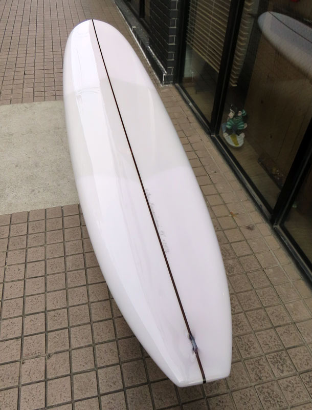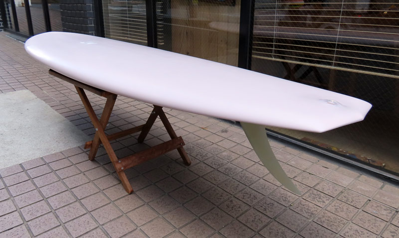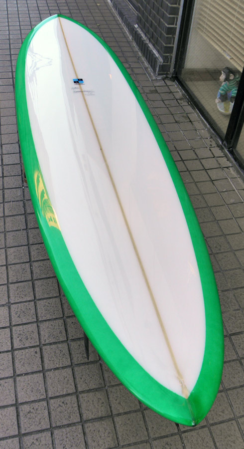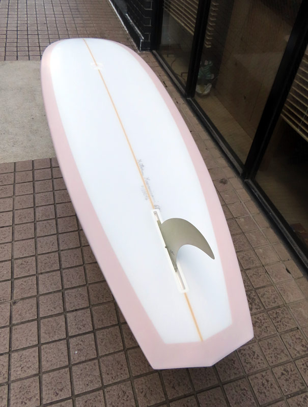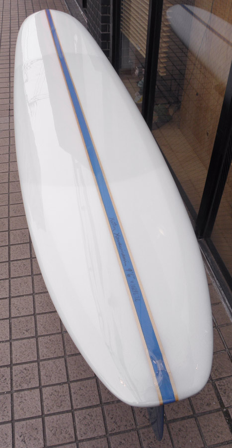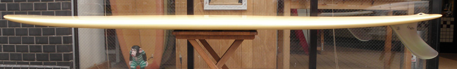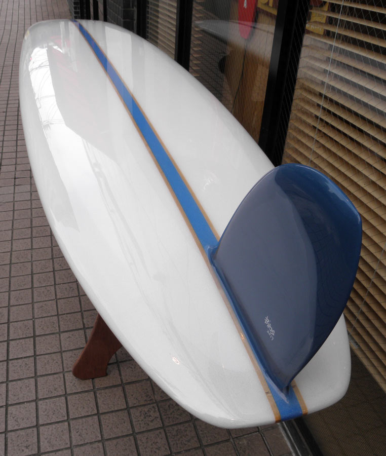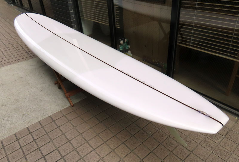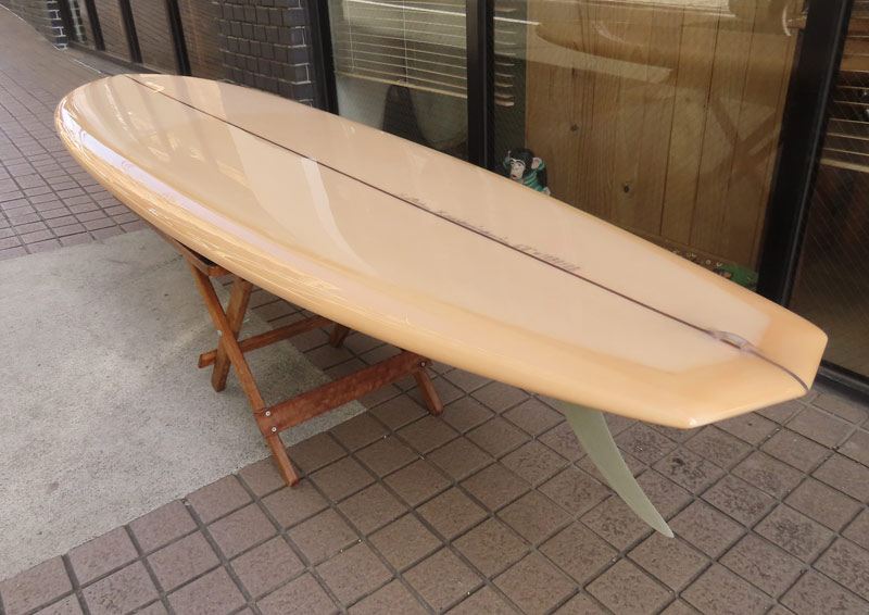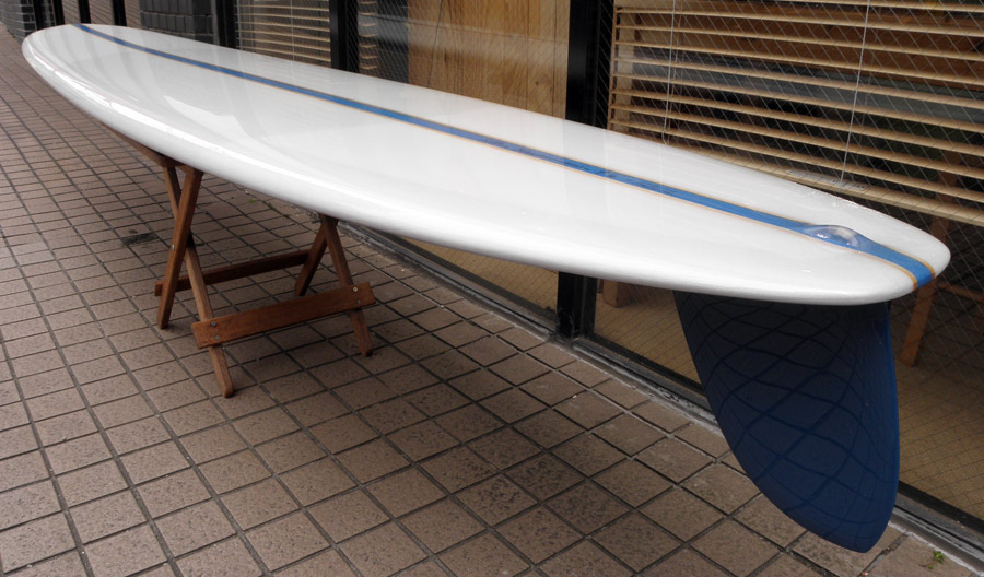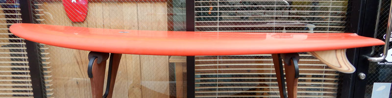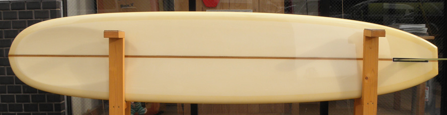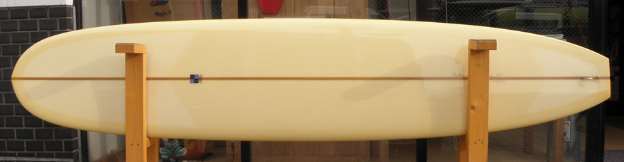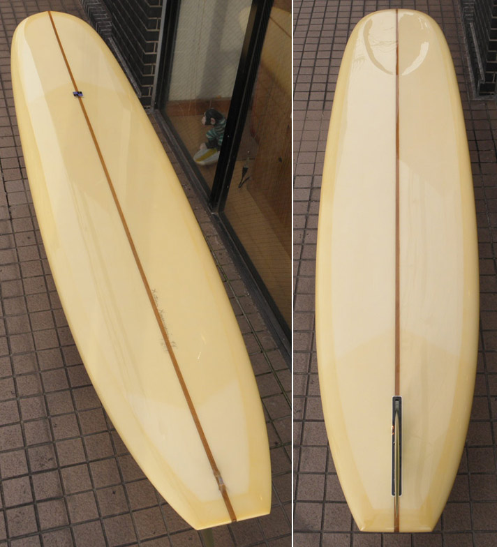 1960年代のPIGをイメージして作ったロングボードです。細身のアウトライン、フラット気味のロッカー、50/50レール、テールエンドにどっしりとグラスオンされたDフィン。どこを取ってもクラシックです。高密度発泡のカラーフォームを挟みこんだダブルストリンガーを8オンスのボランクロスでラミネートしています。