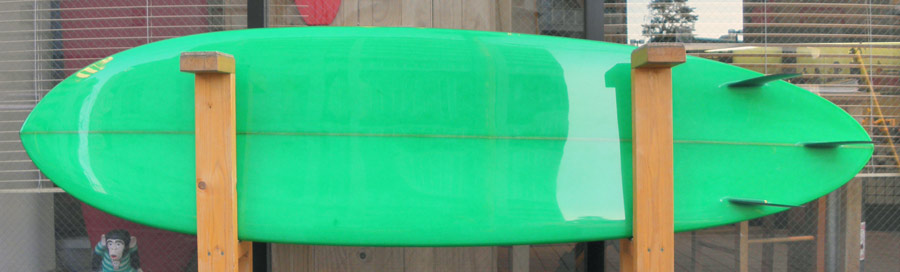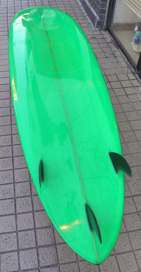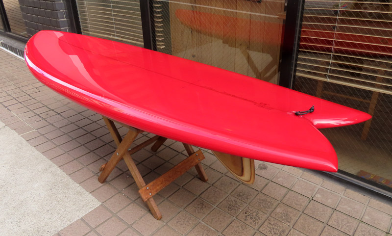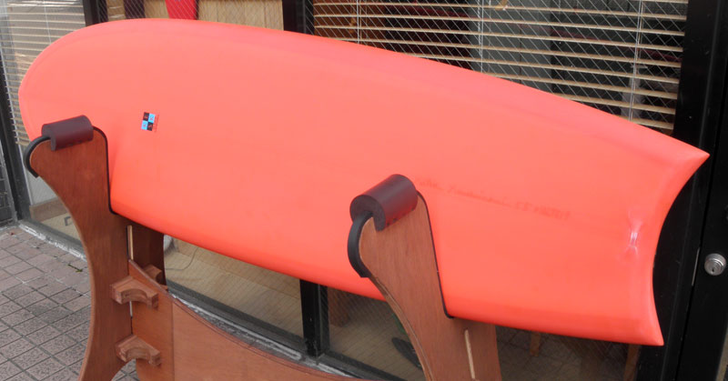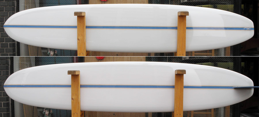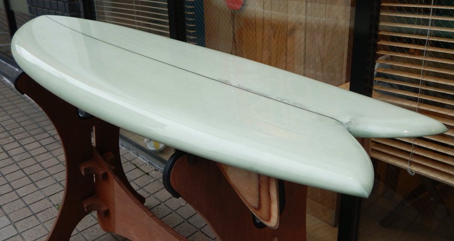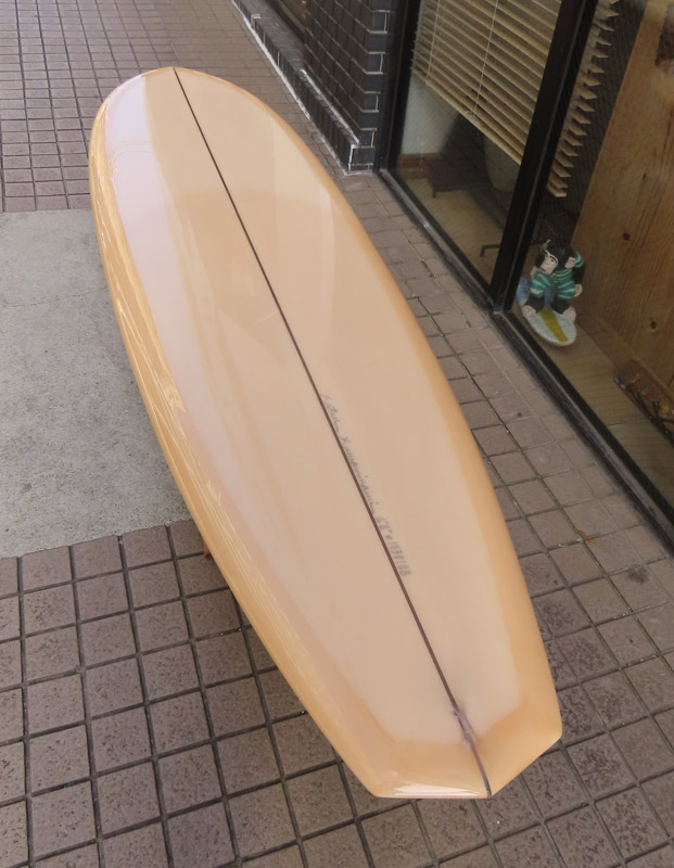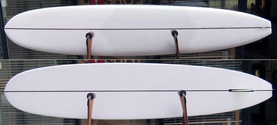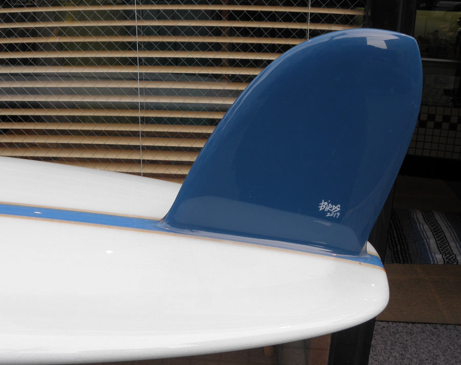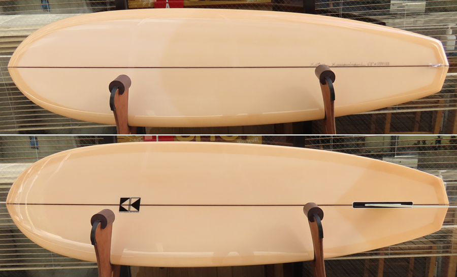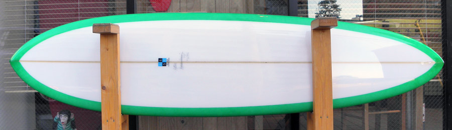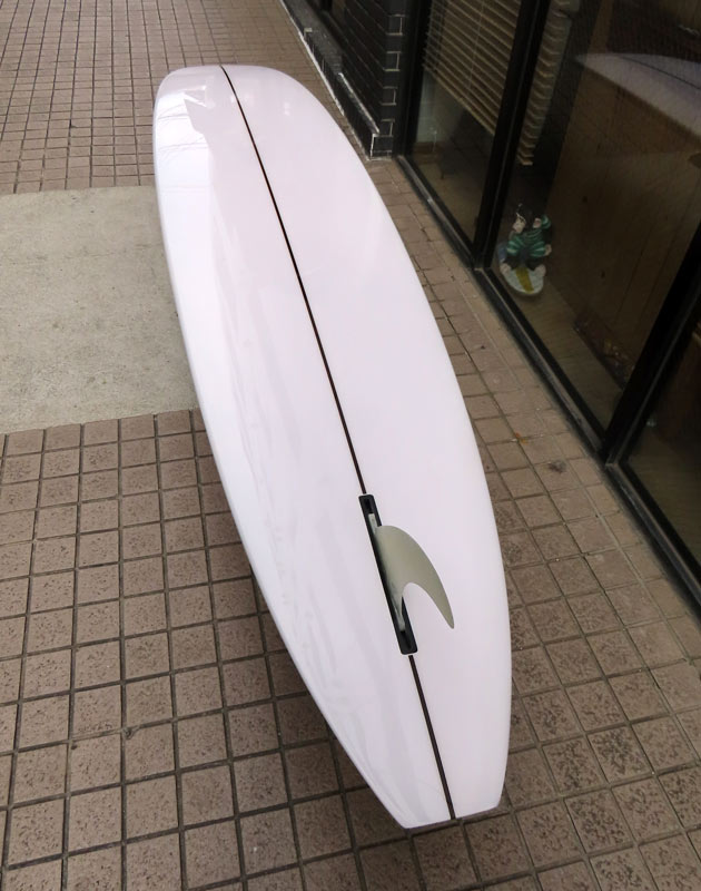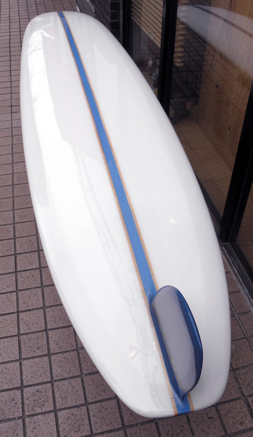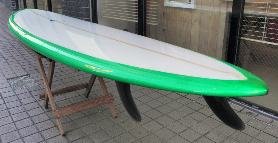 1960年代のPIGをイメージして作ったロングボードです。細身のアウトライン、フラット気味のロッカー、50/50レール、テールエンドにどっしりとグラスオンされたDフィン。どこを取ってもクラシックです。高密度発泡のカラーフォームを挟みこんだダブルストリンガーを8オンスのボランクロスでラミネートしています。
