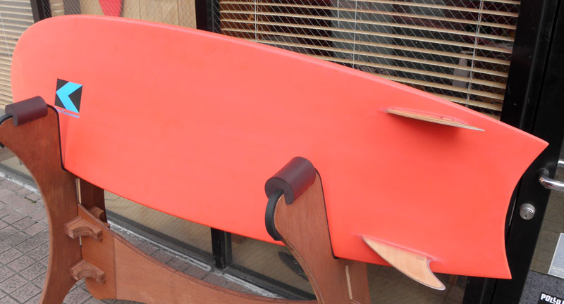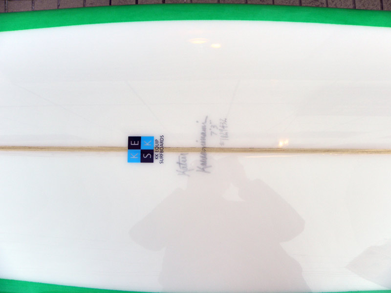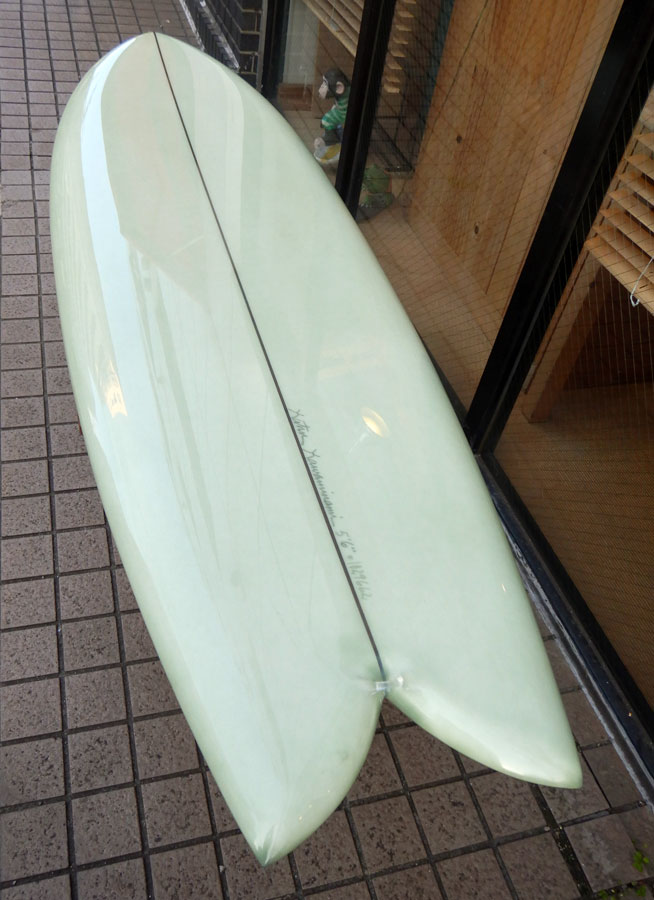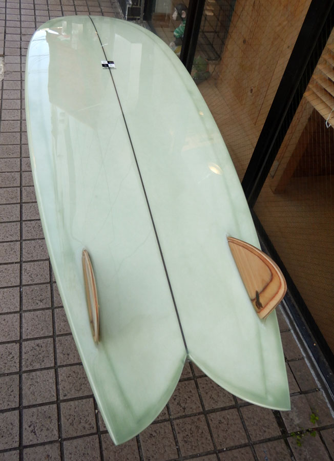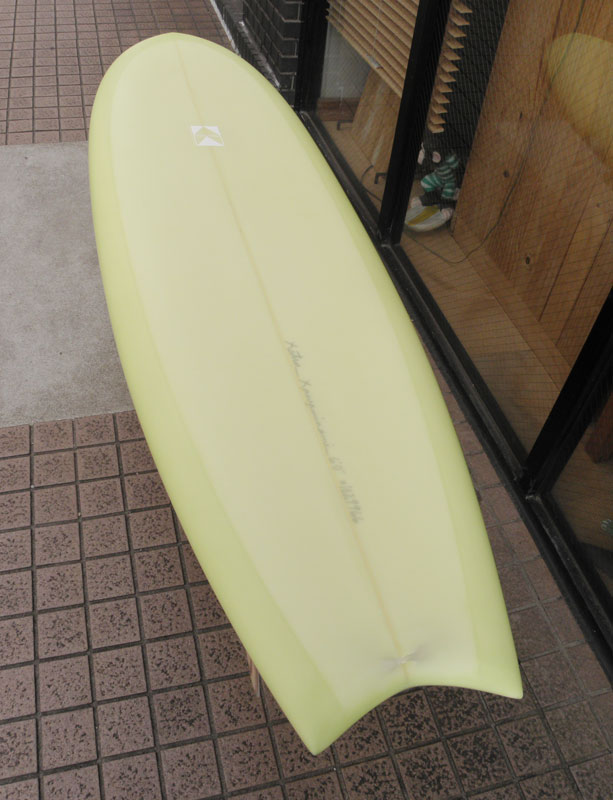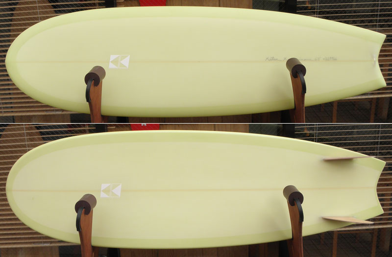 カツカワミナミサーフボードのニューモデル、MOON FISH ; ムーンフィッシュです。モデル名の通りのムーンテールが特徴的なツインフィンです。ボリュームがあるラウンドノーズとパラレルなアウトライン、ボトムはシングルコンケーブです。フィンはKK FISHと同じレイクが入ったキールフィンです。シングルフォイルとフィンのセッティングに角度を持たせることで運動性能を高めています。