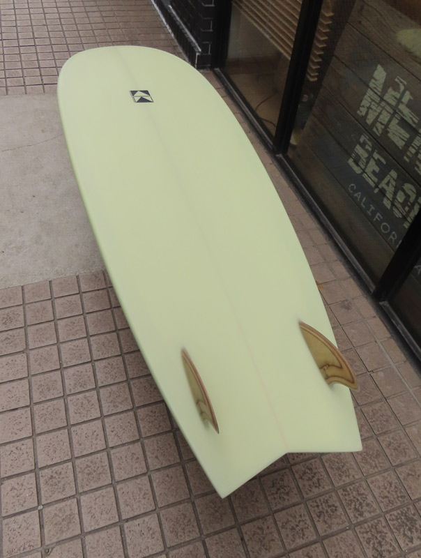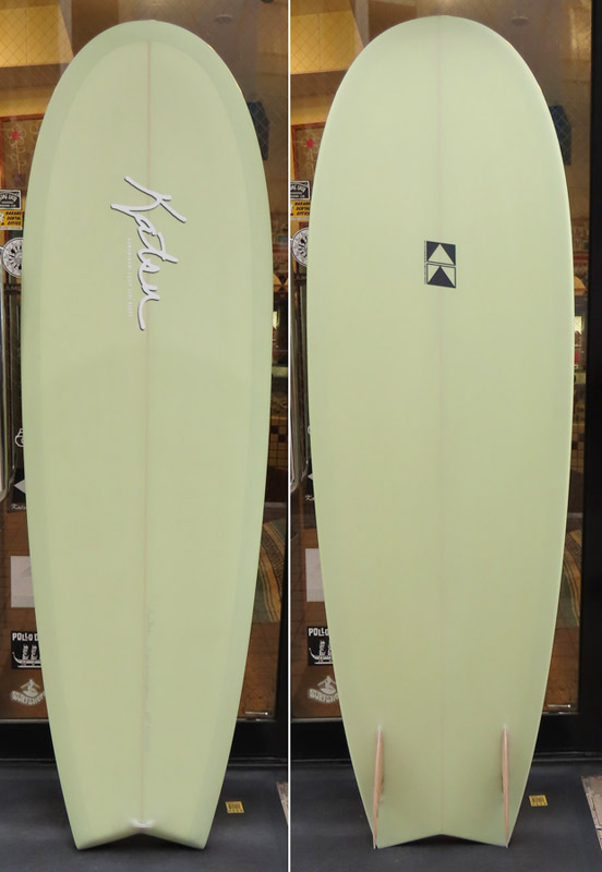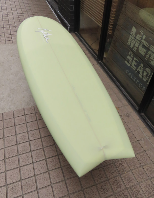 カツカワミナミサーフボード KK FISHです。パドルがイージーでテイクオフが速いラウンドノーズと絞り気味のテールが特徴のフィッシュモデルです。前方寄りのバランスはスピードを付けやすく、クラシックフィッシュよりも絞り気味のテールはストレートなフィッシュよりも軽いコントロールです。フィッシュの感覚は無くさず、クラシックなフィッシュよりも細かい動きに対応できるフィッシュをお探しの方に最適です。滑り出しが速く楽しめるフィッシュは、20年にわたる長く根強い人気があります。