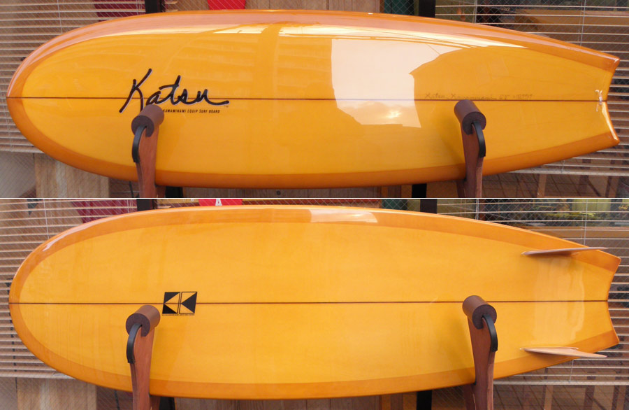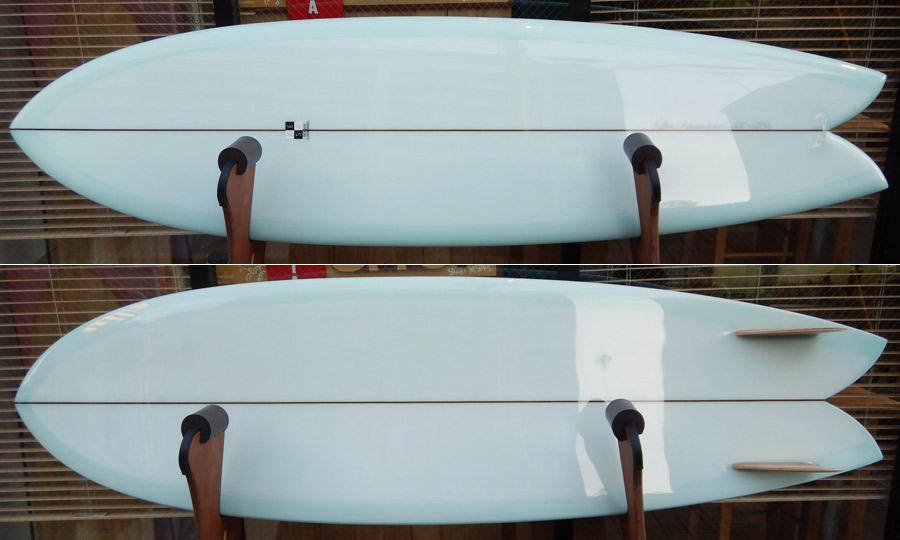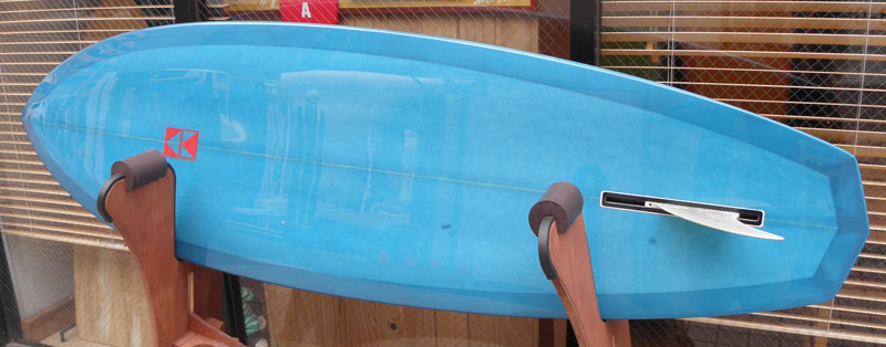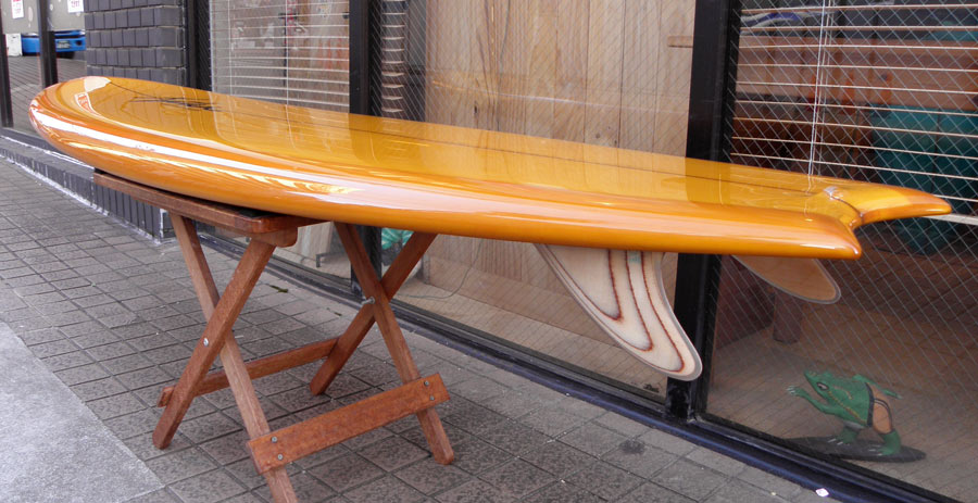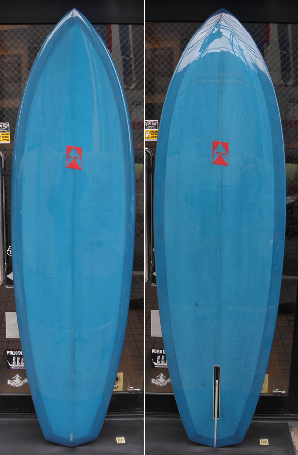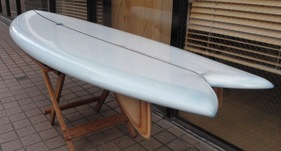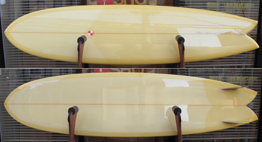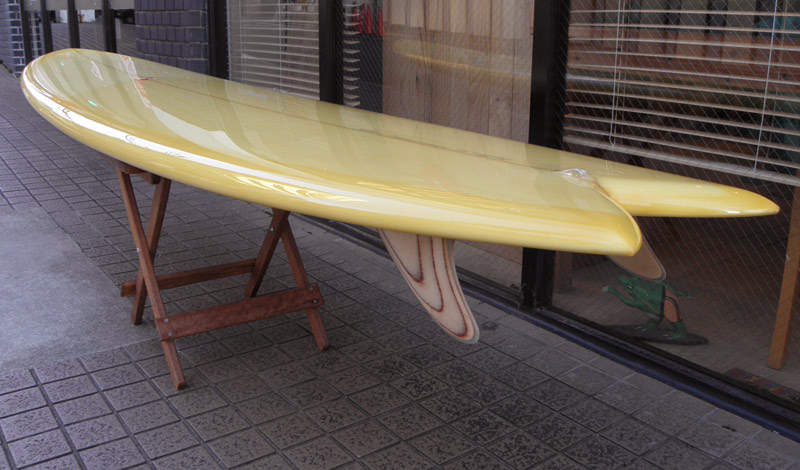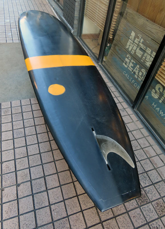 ライアン・ラブレイスのシェイプによる、ポイント・コンセプトのユーズドロングボードです。興味をそそるシェイプです。レールはナイフィーな50/50で、ボトムは全体的に滑らかなコンベックスが基調になっています。ノーズは浅くスムースなノーズコンケーブ、その後ろは緩いラウンドボトムからテール回りはパネルVEEで、滑らかな滑走としっかりとしたコントロール性を生み出しています。テールはノーズライディングのためのアッシュトレイ形状です。浅いフットマーク、ボトムには小さな浅いヘコミがいくつかありますが、全体にきれいなコンディションです。