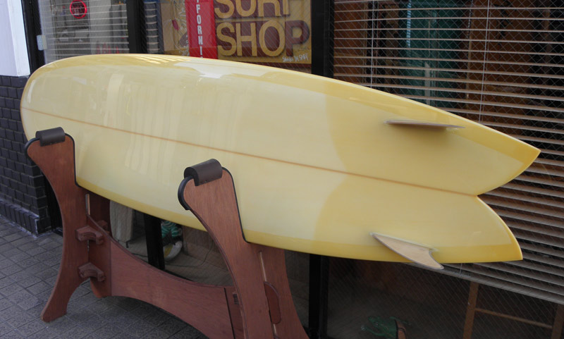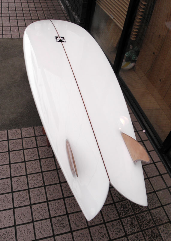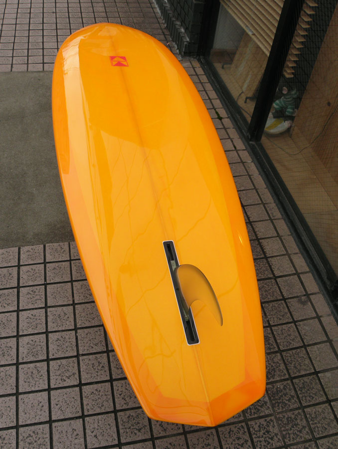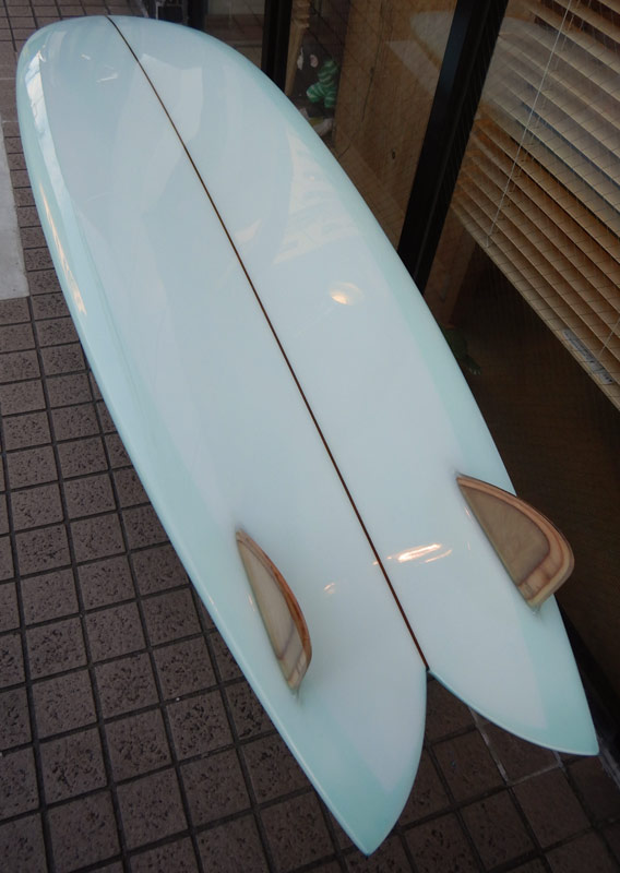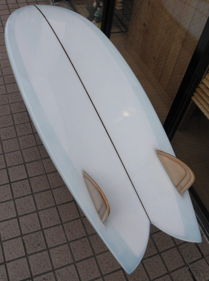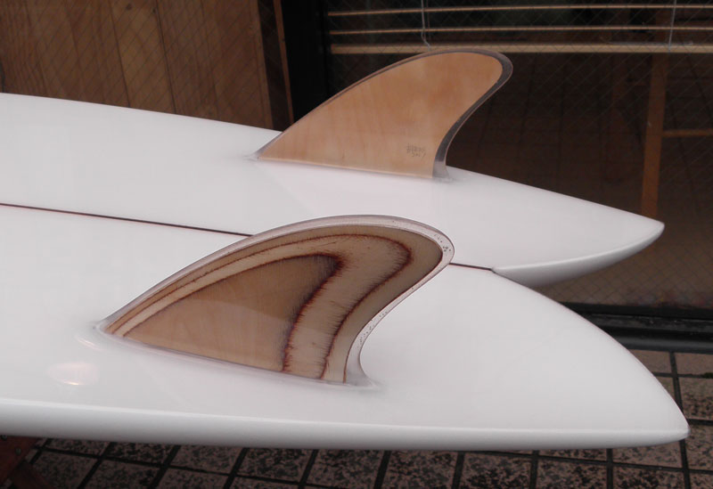 ダブルフォイルのウッドキールフィンをグラスオンしています。